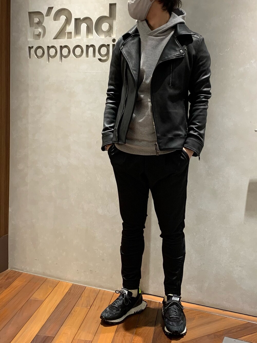 レザーにトラックパンツでラグジュアリースポーツなコーディネート。