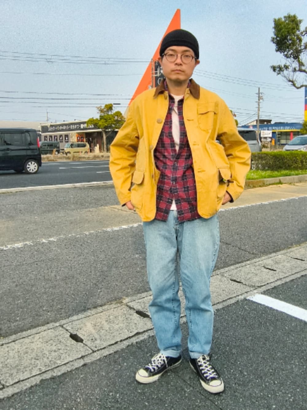 キャップ、ロイフトフォイヤー、2000円 ハンティングジャケット、シアーズ、12000円 シャツ、1000円 パンツ、エルエルビーン、2700円 シューズ、コンバース、5500円