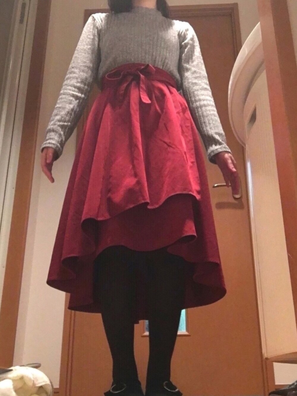 すべて40-80%割引でお得に買えたものです。 スカートは後ろに向かって丈が長くなっていますが、153センチでもヒールのあるシューズを履かずに着られました。