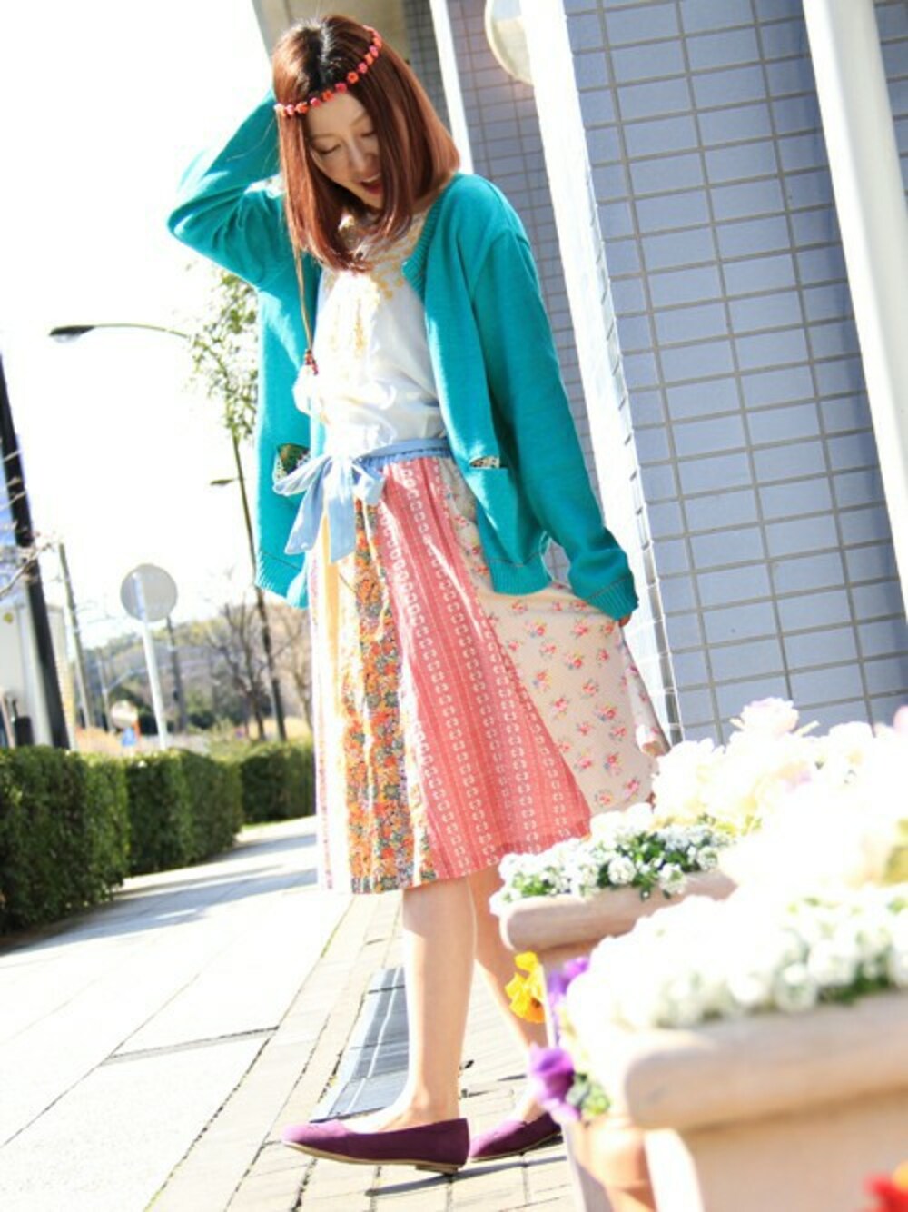 ビビットなカーディガンとパッチワークを組み合わせた春コーデ◎