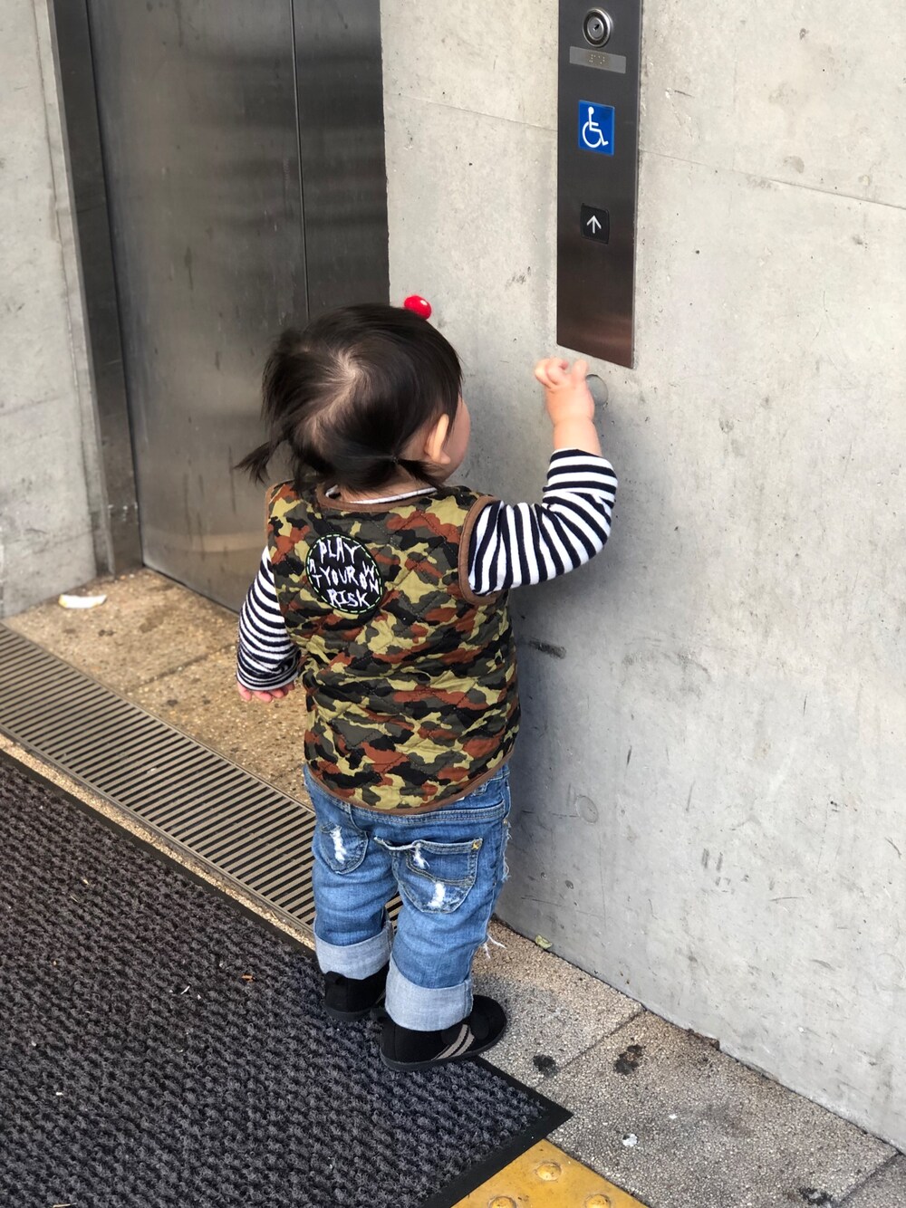 4色買ったユニクロのカットソーは万能。 おさがり会でゲットした迷彩ベストに ワッペンをつけました。 play at own risk ロフトマンの横