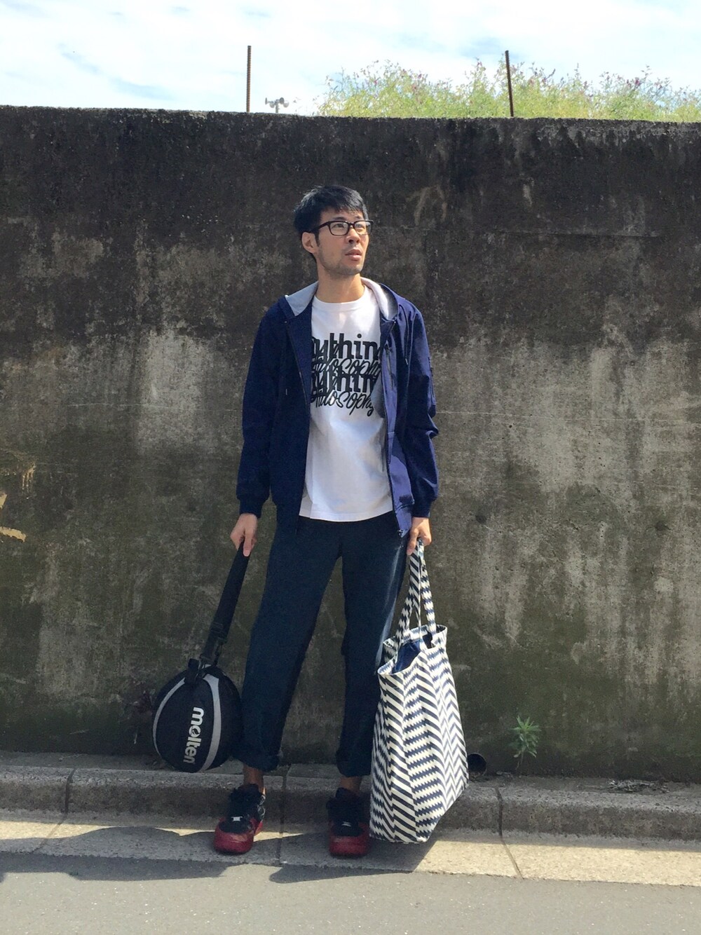 これからバスケの試合です。 アウター:URBAN RESEACH Tシャツ:WTAPS ボトム:UNDERCOVER × Dickies バッグ:mintdesigns × FABRICK メガネ:VIKTOR & ROLF シューズ:NIKE