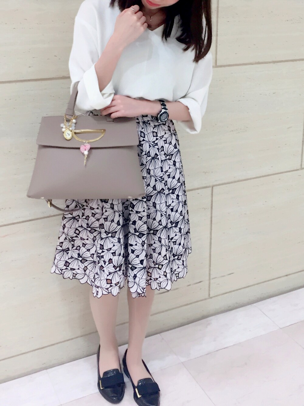 華やかな花柄スカートに大人レディなグレージュカラーを合わせて上品コーディネート♡