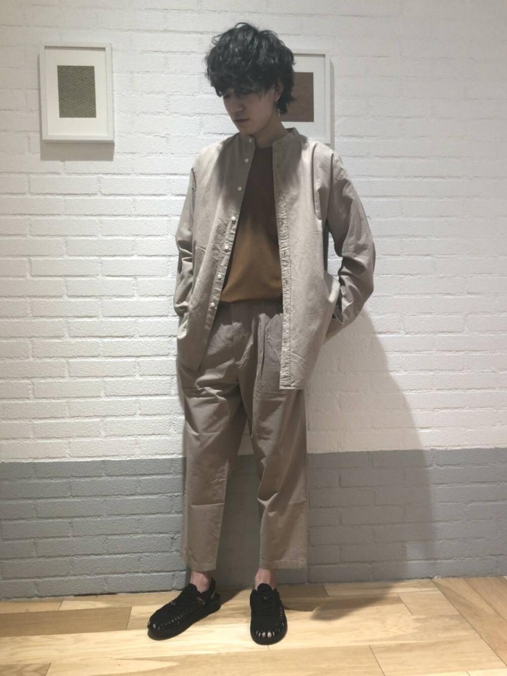 ご覧頂きありがとうございます。和紙を使ったシャツをベースにブラウントーンでまとめました。 通常のバンドカラーシャツより着丈が長く素材感が夏らしいので一味違ったシャツでこれからの時期を過ごしてみるのはいかがでしょうか。