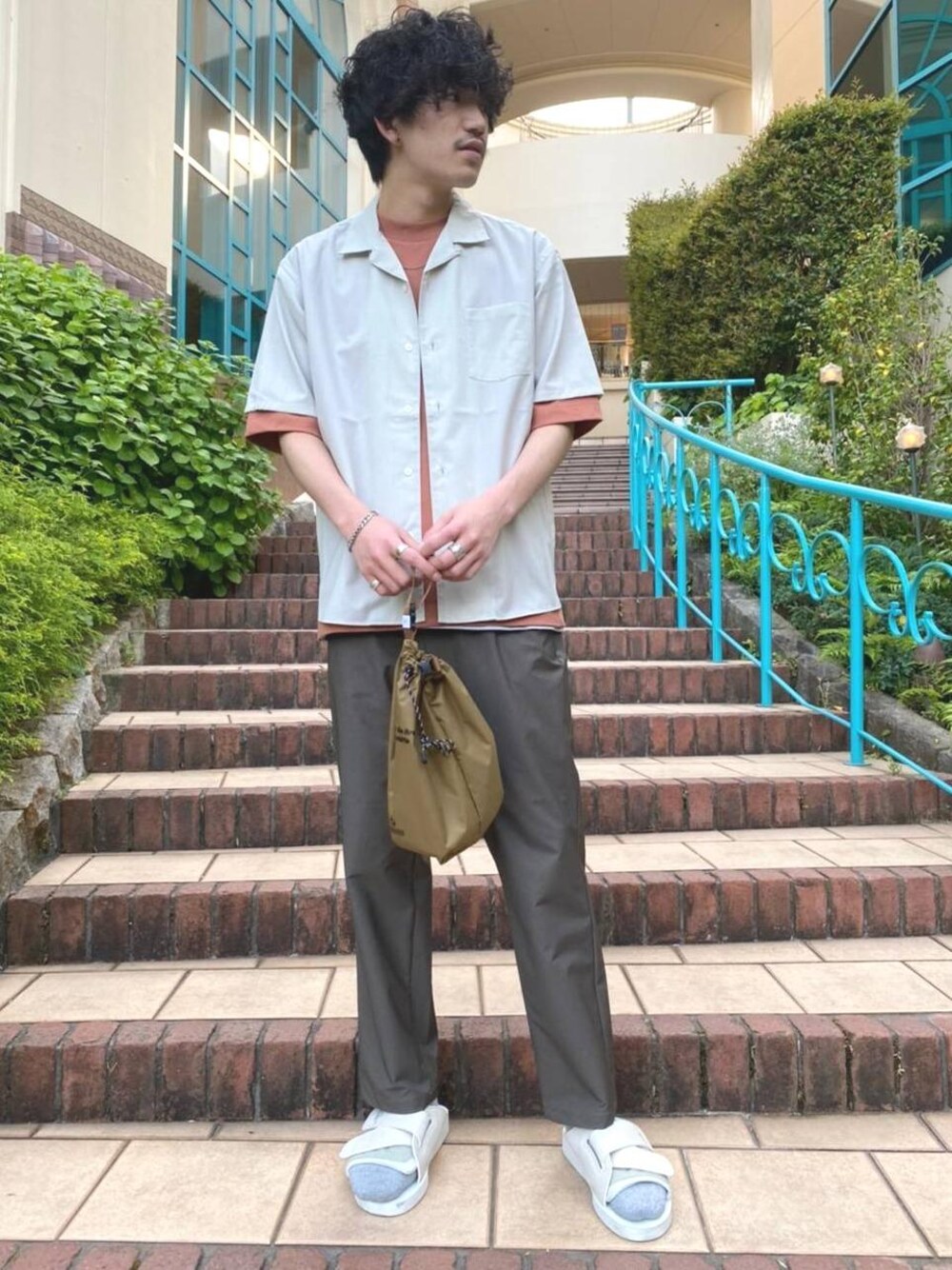【身長180cm SIZE 全てL】柔らかい色のオープンカラーシャツを暖色系でまとめました。これからの夏の時期に向けて、足元はサンダル合わせがオススメです。