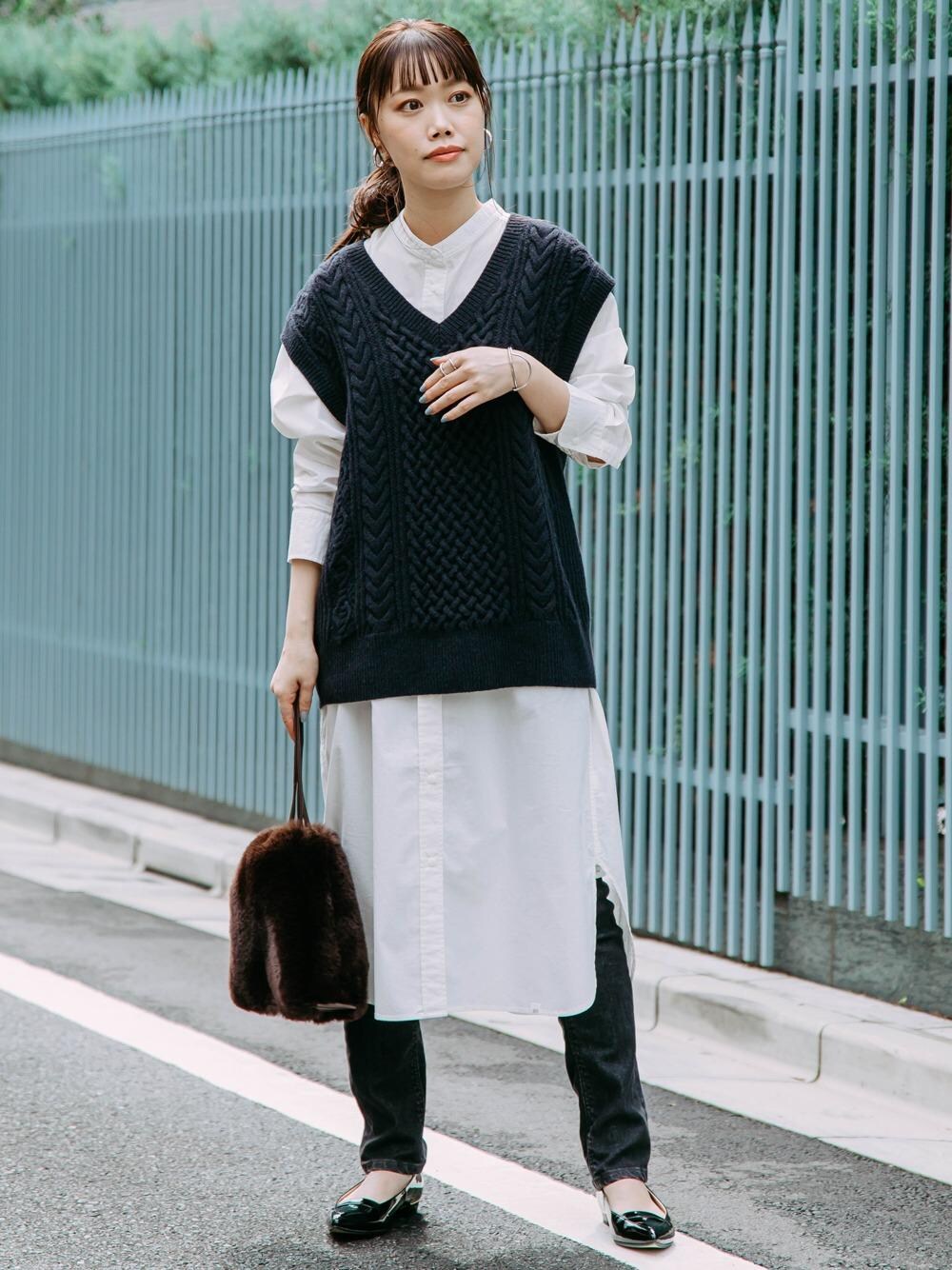 【身長:161㎝ 着用サイズ:パンツMサイズ その他全てフリーサイズ】 ニットベストを取り入れたレイヤードスタイル。 もこもこのバッグが冬の気分を盛り上げてくれます。