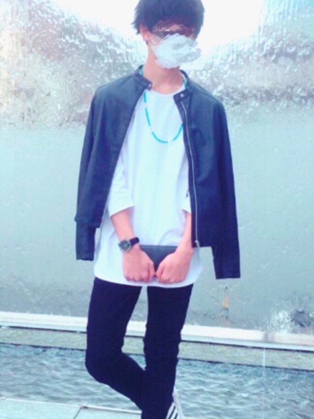モノクロなコーデなのでネックレスを青色にして少し明るい感じにしました👯 とても簡単でウケもいいと思うのでよかったら参考にしてください😎