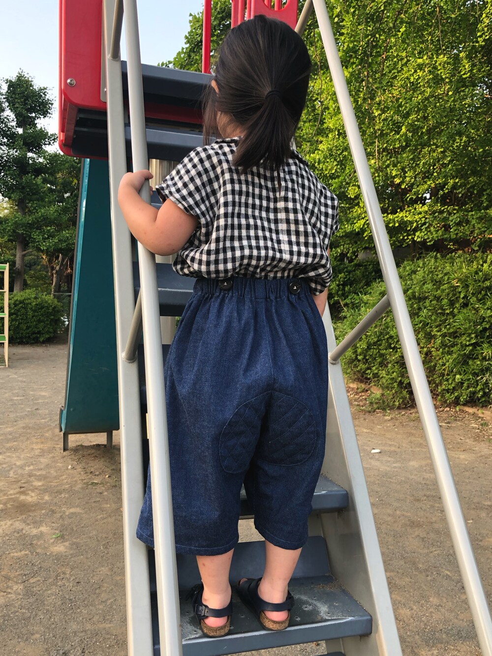 肩紐取外し可能なデニムパンツ おしりのキルティングがポイント こちらは外した状態 ウエストにボタンは残ります。 肩紐付いた状態は過去の投稿見て下さいねー 販売はホームページにて近日 https://kikkingum.base.shop/