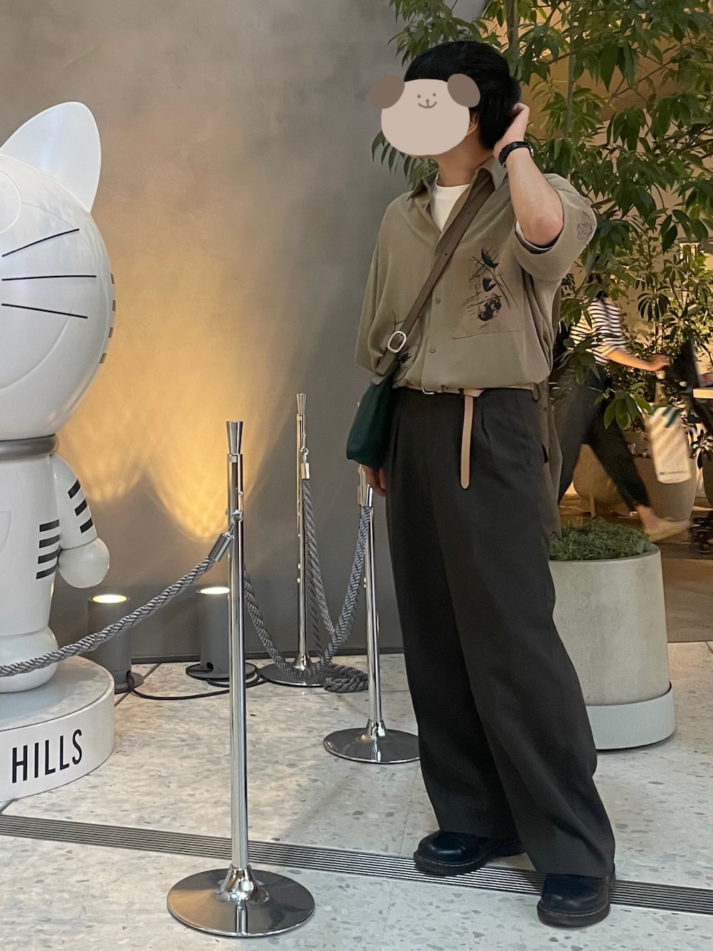 全体的に落ち着いた色合いで統一してタックインでより大人めな雰囲気に。 バッグの色味がより引き立っていて良き。