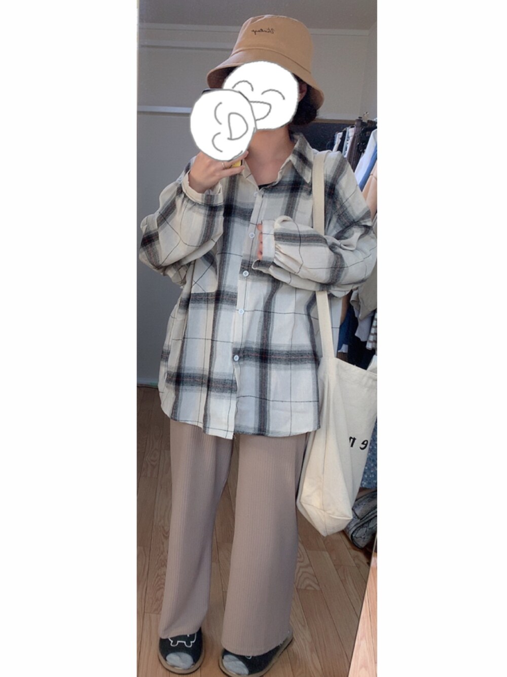 GRLのオーバーチェックシャツが、カジュアルでゆるかわすぎ!バケットハットと合うね 家なのでスリッパです 外ではベージュのキャンバススニーカーを合わしてます