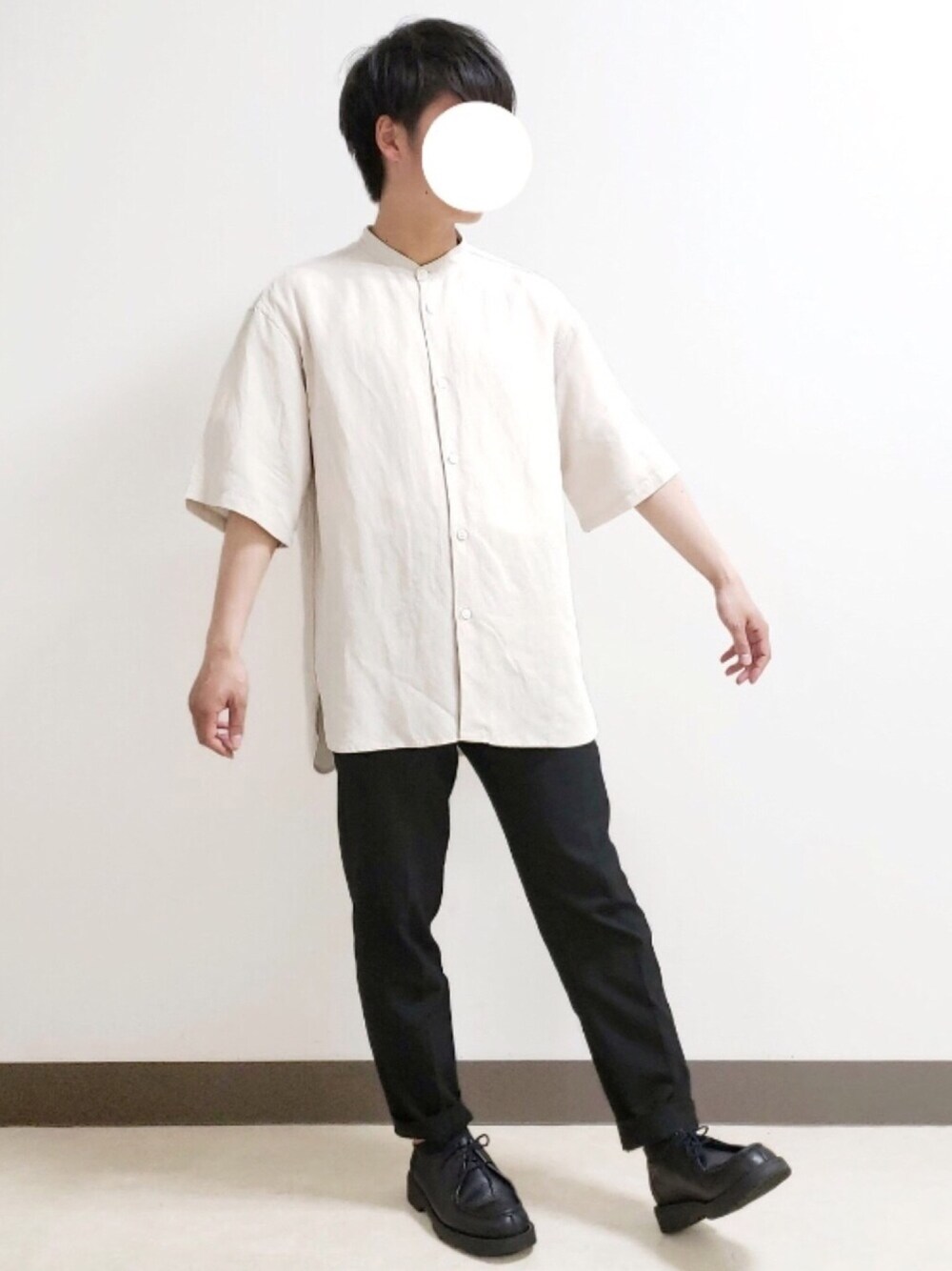 beauty & youthのバンドカラーシャツ着用しました。 色味、サイズ感、生地ともに気に入ってます。 今回は革靴にスラックス合わせて、シンプルなコーデにしました。
