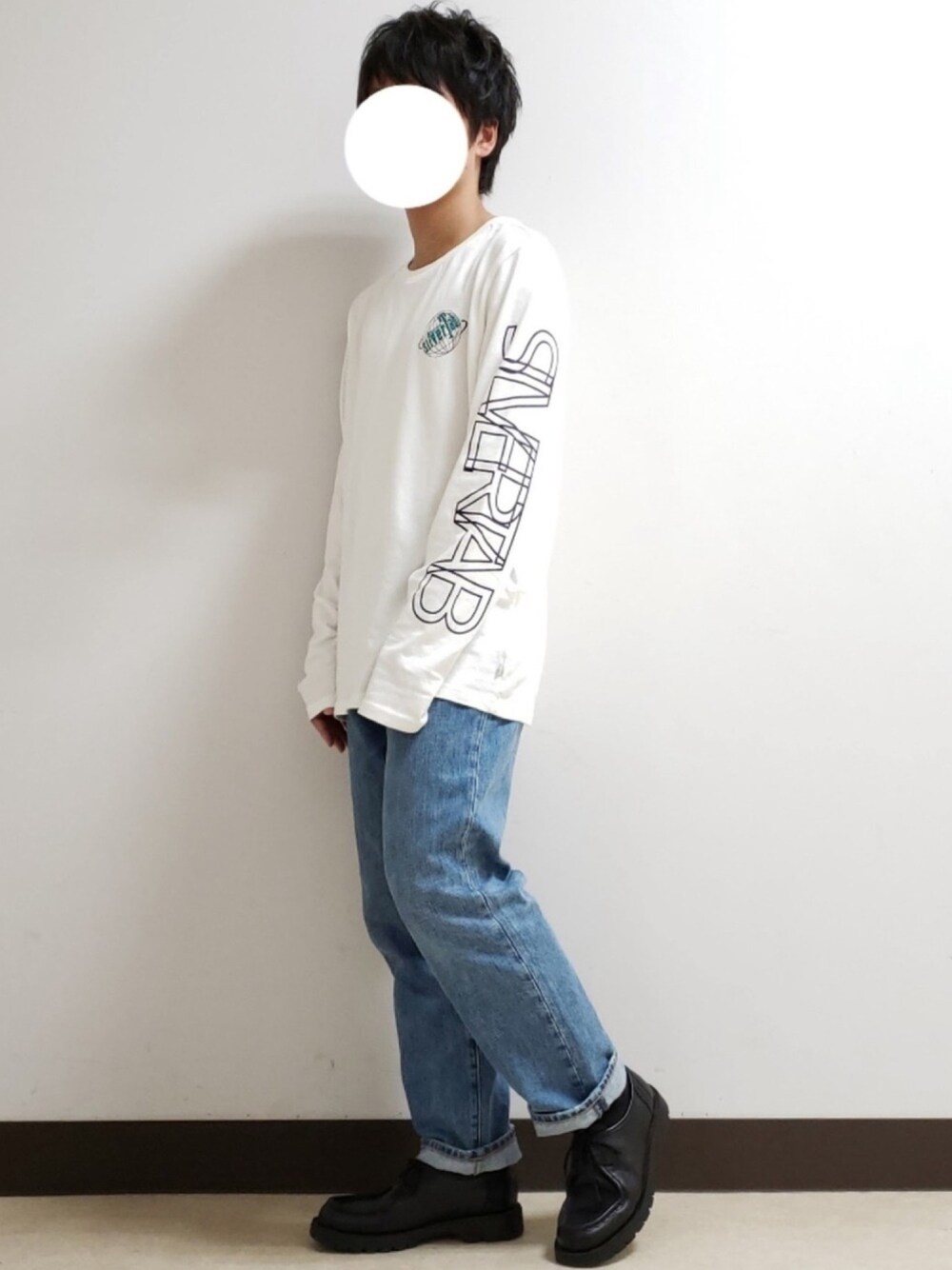 シンプルにロンTとデニムを合わせました。 全体的にカジュアルな印象なので、革靴履いてバランス整えました