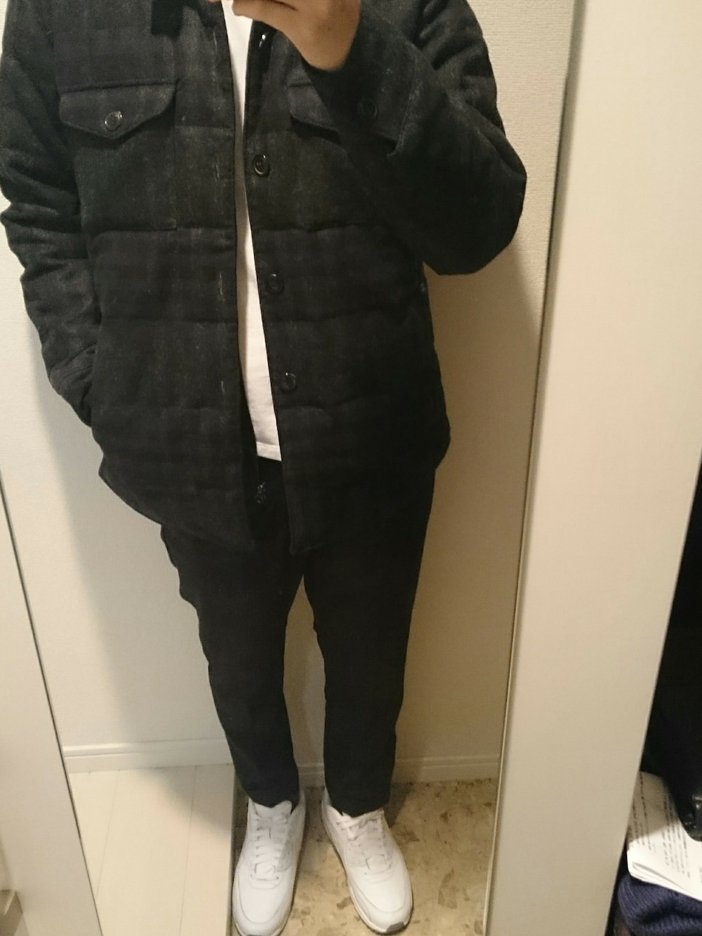 ダークトーンだとチェック柄も抵抗なく使えます 薄手のダウンでこの時期から使えます
