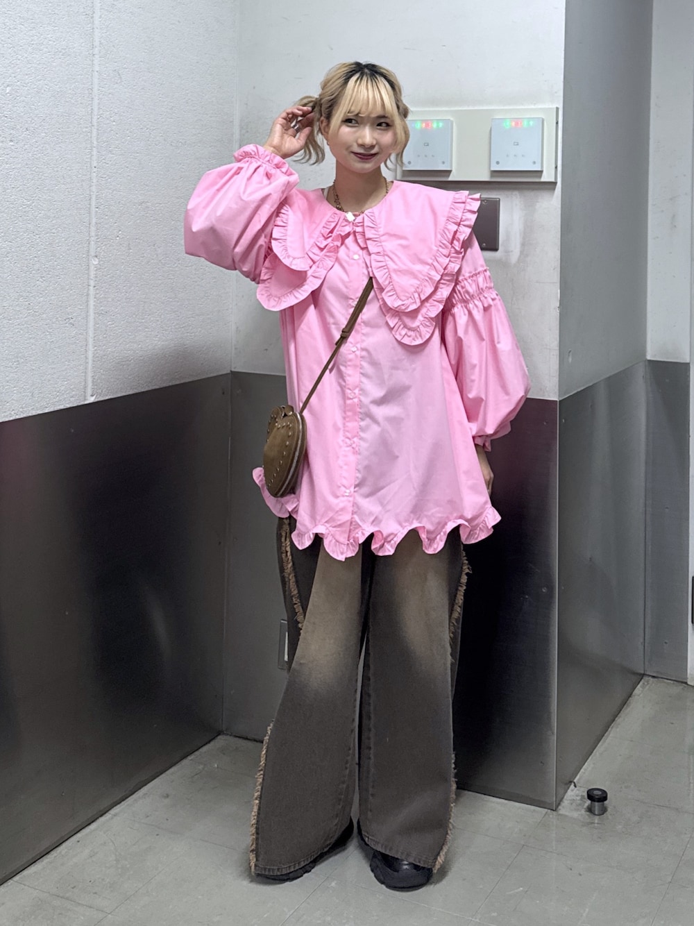 ご覧頂きありがとうございます♩ 160cm 骨格ウェーブです! ブラウス 大きいフリル襟と裾のデザインが可愛すぎるブラウス♩お尻隠れる長さだったので、ミニワンピとしても着れます!上からニット合わせても可愛い♡周りと被らないデザインなので、一癖あってお洒落見えします! デニムパンツ Mサイズ着用しています。ウエスト後ろはゴムになっていて下半身カバーされるシルエットなので、メリハリあってスタイル良く見えます!生地は柔らかいので動きやすく、年中履いて頂けます♡ Instagram @ntm10__