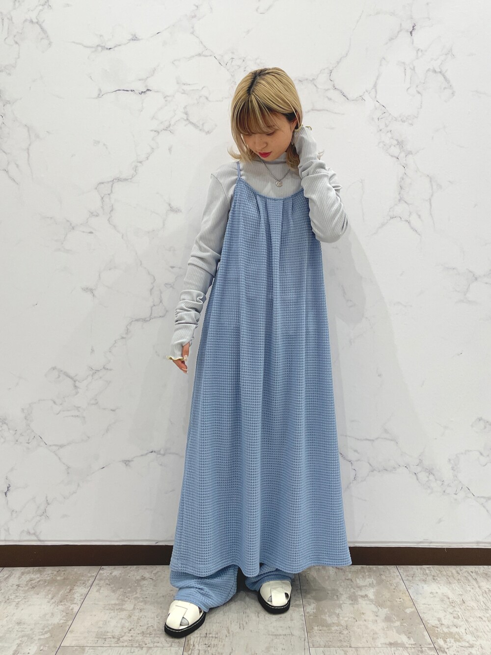 ブルーのグラデーションでワントーンコーデに🧞♂️ 親指だけ出るタートルネックはオシャレさんに大人気です! ゆったり着るのが好きな方にはオススメしたいセットアップ、トレンドのグルカサンダル合わせでカジュアルガーリーに◎
