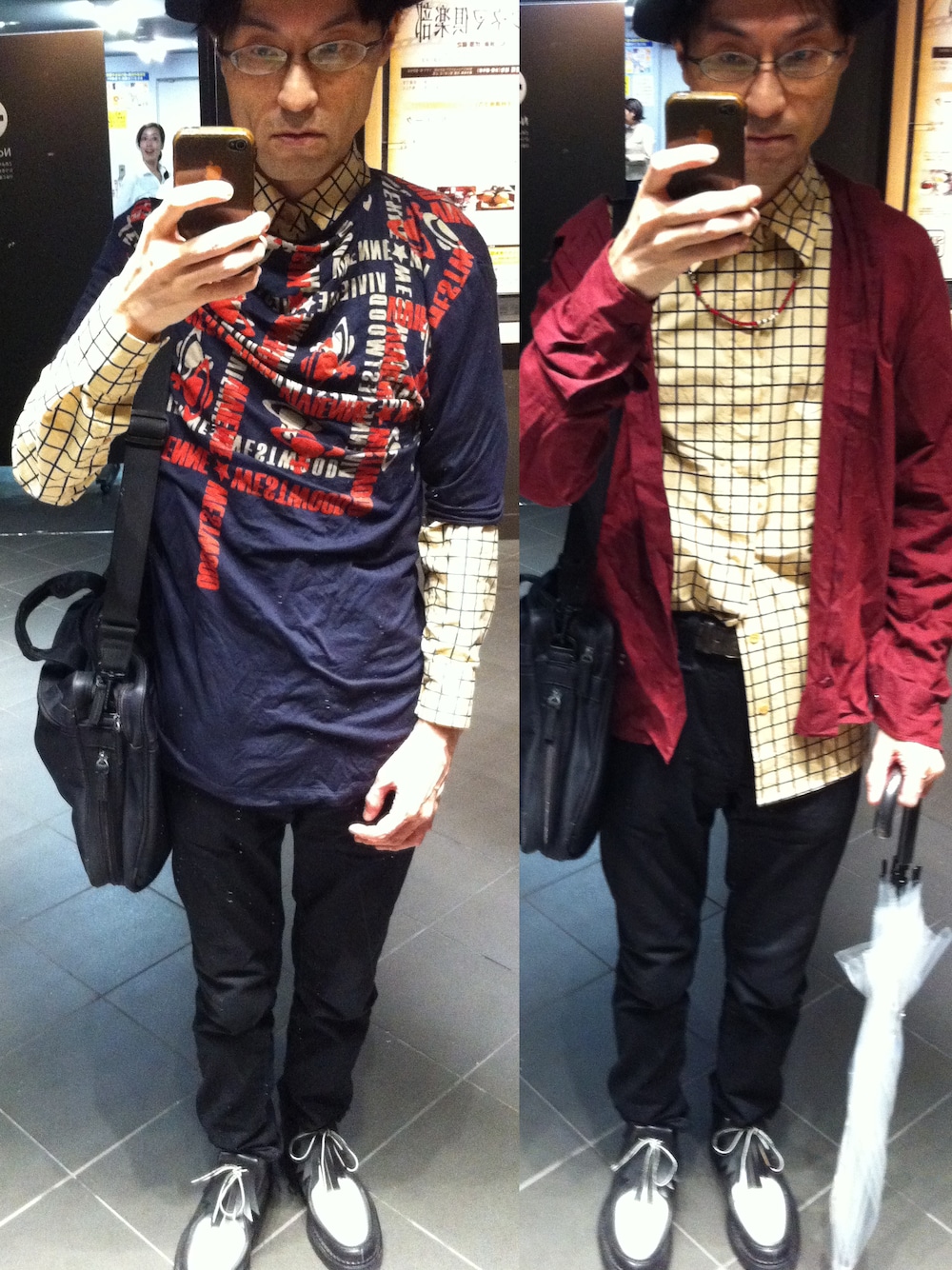 見て下さりありがとうございます。 投稿するのが遅れて、1週間も前、6/25の服装です。と言っても、エアコンが効いた場所でしかこの格好をしていないのですが。 <MARNI>の2018年春夏のショーをネットで見て、シャツを重ね着しているのが印象に残ったので、真似してみたのが画像右の服装です。えんじのシャツは<アニエスベーオム>のです。 画像左、<Vivienne Westwood MAN>のカットソーを初めてシャツの上に重ねてみました(今まではニットやカットソーに合わせたことはあっても、シャツと合わせたことはなかった)。合っているのかどうか…ちょっと無理がある気もしますが、試してみました。 暑い場所ではシャツだけ着ていて、上に重ねたシャツとカットソーは鞄に入れていたので、しわくちゃです(汗)。