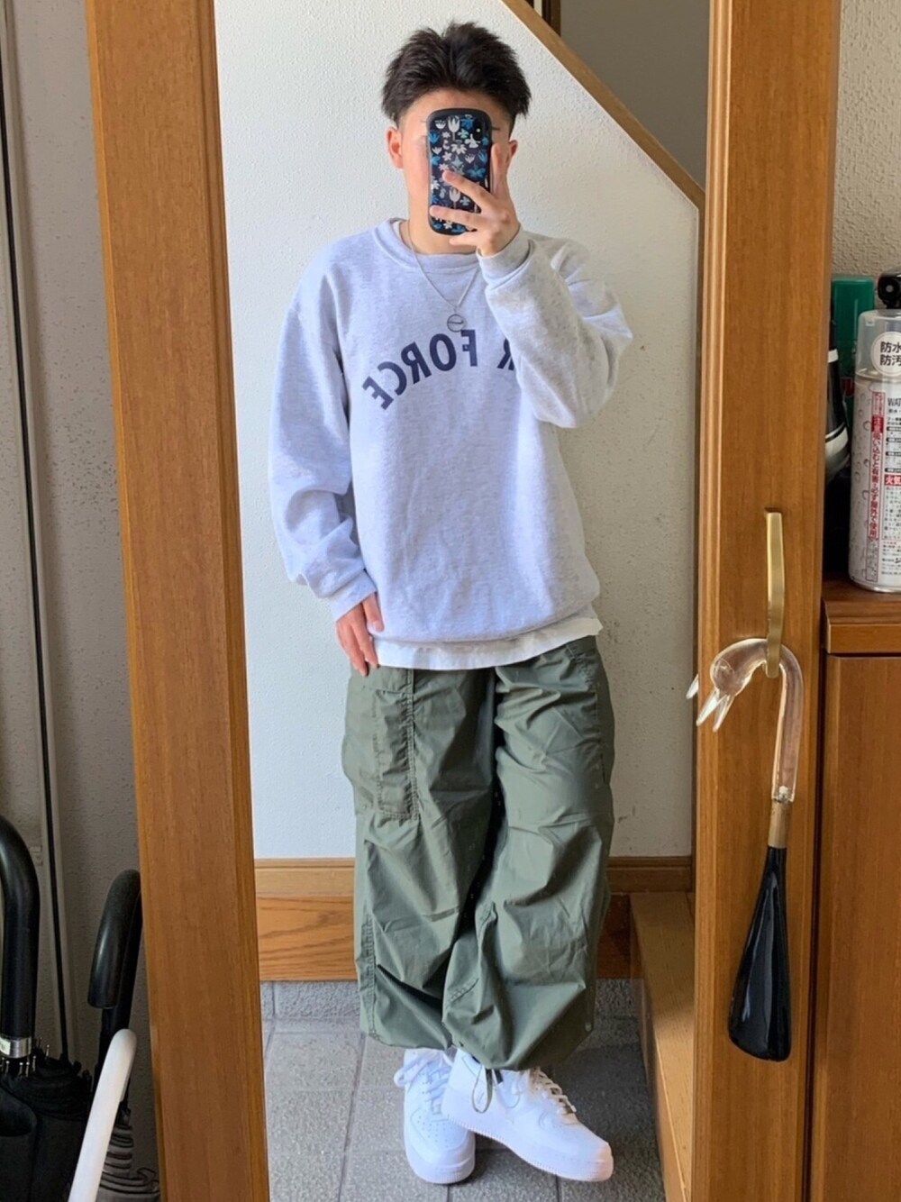 GUのカーゴパンツいいね! air forceと1とネックレスで統一感 パンツは腰で2回折ってます!