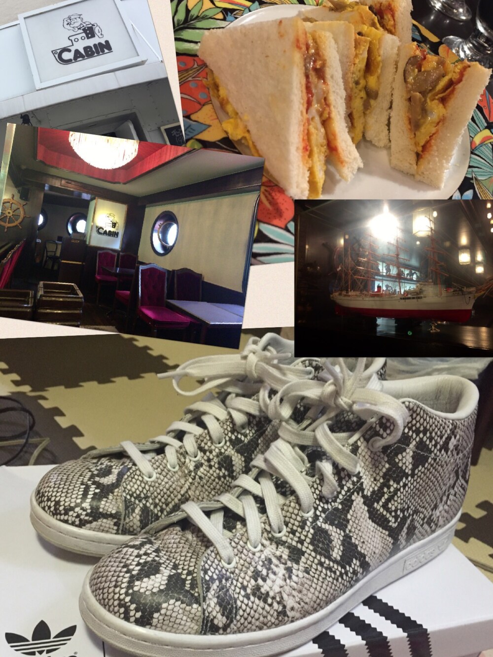 enfoldのパンツ買って以来、ハイクアディダス欲しいけど、なかなかサイズもなくネットでだと試着できないし、、、って、思ってたらタイミングよくアメ村のカインドさんに13000円台であったんで、いらなくなったrickowensのパンツ売って買っちゃった😂💕 スニーカー買っても売った分お金余ってたんで、前から気になってた船の中みたいな内装のキャビンという喫茶店に♪( ´θ`)ノ 朝、サンドイッチ食べたのにタマゴサンドの誘惑に負けてお昼もサンドイッチという、サンドイッチマンっす今日🙈🙈笑 もちろんタマゴの美味しい風味が最初に来たと思ったら次はキノコの美味しい風味が来て、後を追いかけるようにトマトソースの酸味の効いた味がマッチしてかなり美味しい💕🎶 さて、今から頑張ってスニーカー中古で汚れてるんでマイ道具で今から綺麗にしてシューグーでカカト保護しまーす(=´∀`)人(´∀`=)