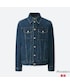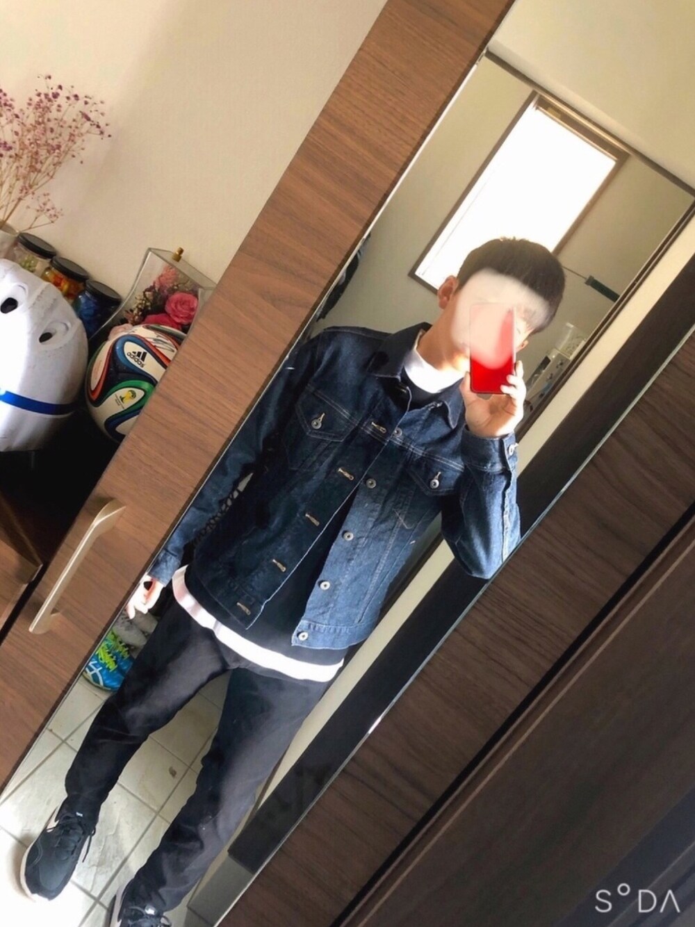 デニムジャケットコーデ.1 白ハイネックT 黒Tシャツ 紺デニムジャケット 黒スキニーパンツ