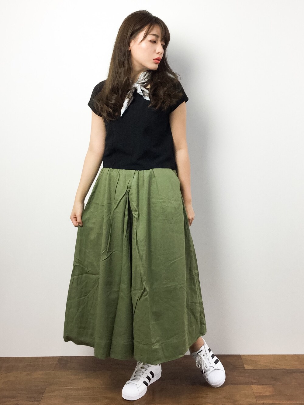今季トレンドのスカーチョをメインにコーディネートを作りました。 ボトムス、トップスともにシンプルだったので首元にバンダナを巻いて♪ 足元はスニーカーでシンプルカジュアルに◎