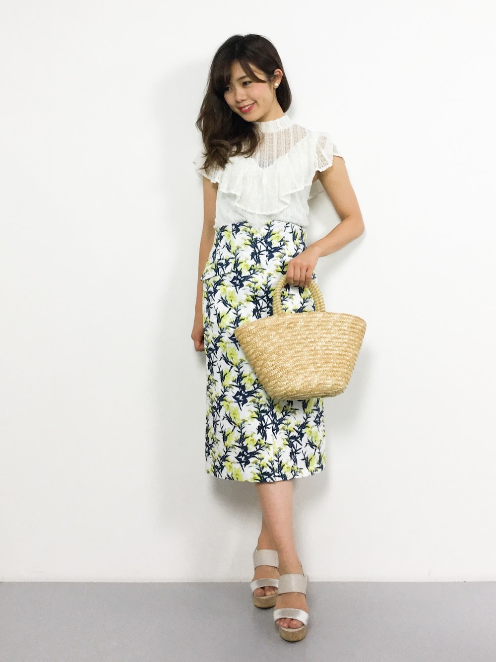 夏のデートスタイル♪ 透け感のあるフリルブラウスに、 花柄スカートを合わせて 思いっきり夏らしくしてみました^^ スカートはただいまセール中です!