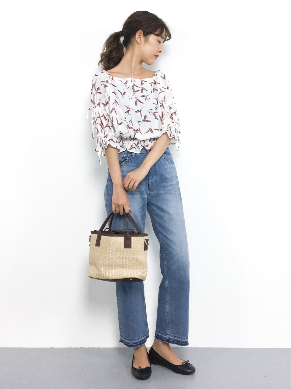 涼しげなリーフ柄トップスで大人カジュアルスタイル○