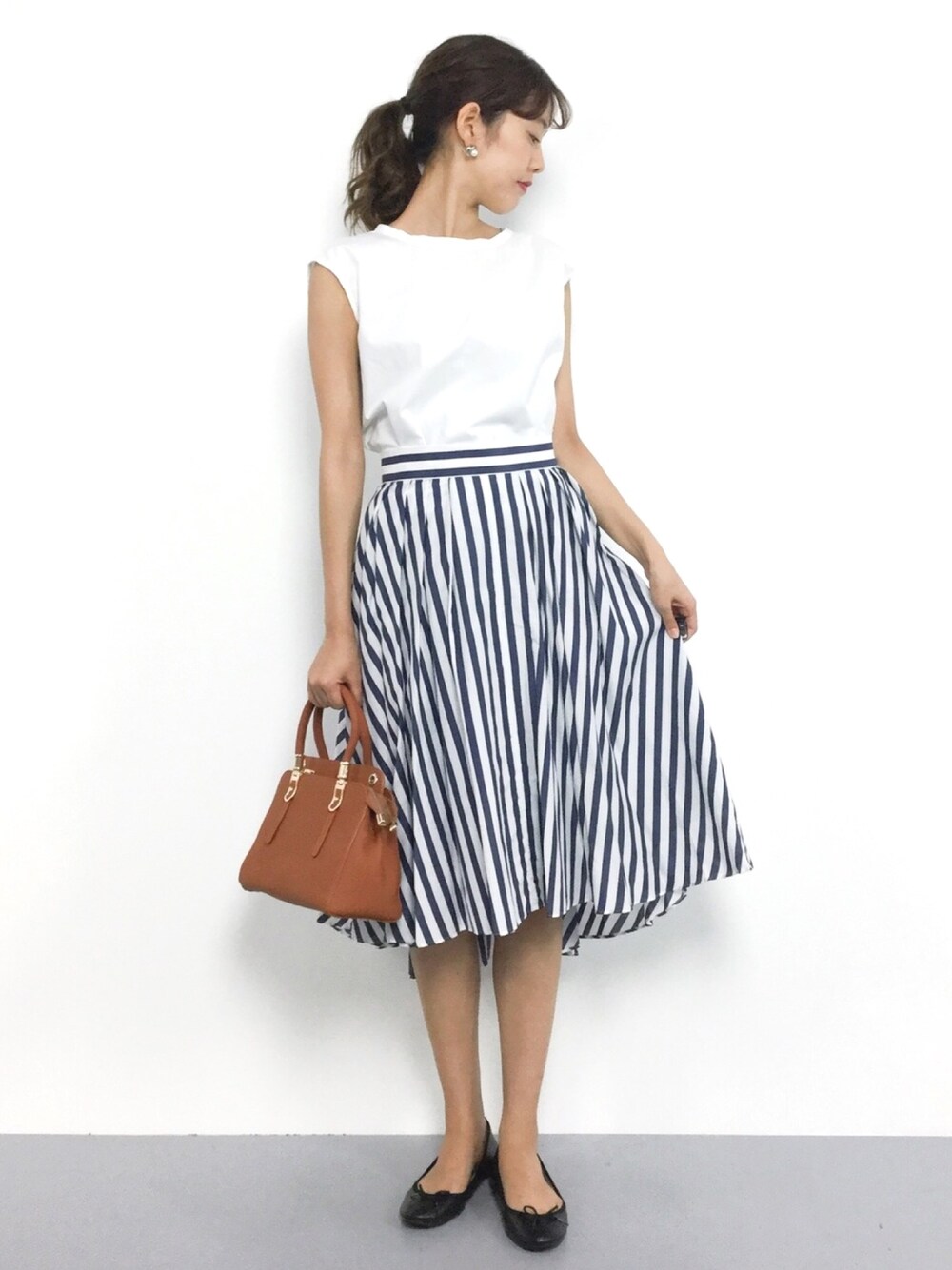 ストライプスカートを主役に、 シンプルなアイテムを合わせた大人カジュアルスタイル○ スカートとバッグは、ただいまセール中でお安くなっています! オススメですよ~^^