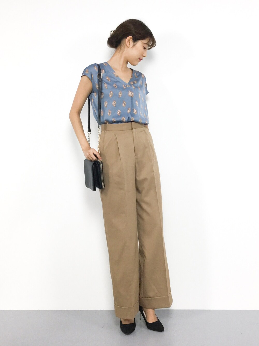 夏にピッタリなペイズリー柄のブラウスを主役に、 シンプルなアイテムでまとめました◎ パンツは幅広いシーズンで使っていただけそうです♪ シルエットも綺麗なのでオススメ! ただいまセールでお安くなってますよ^^