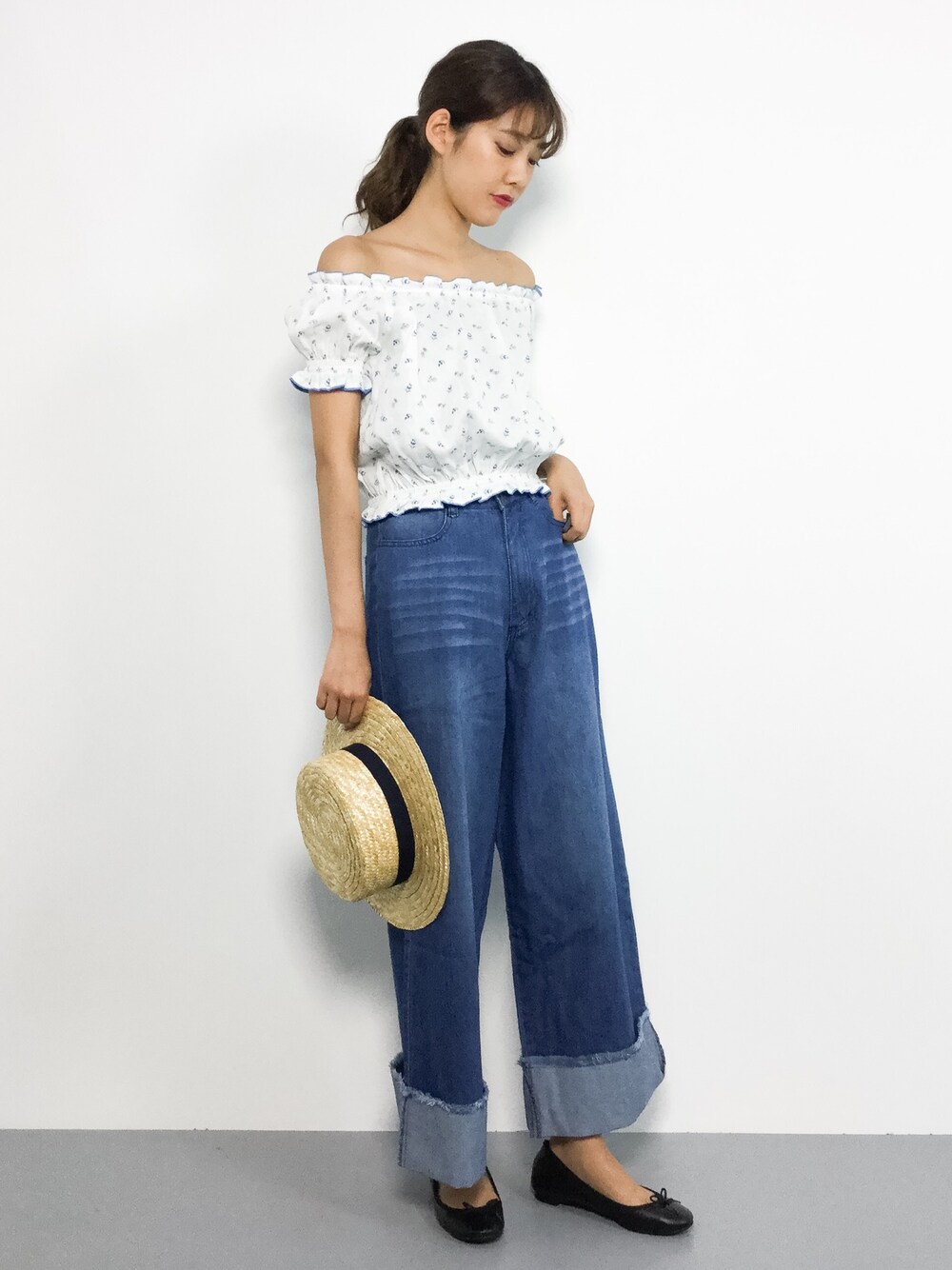 オフショルトップスで夏全開!コーデ ブラウスはコンパクトなシルエットなので、 ワイドシルエットのボトムスと相性◎ トップス、デニム共にセール中ですよ^^