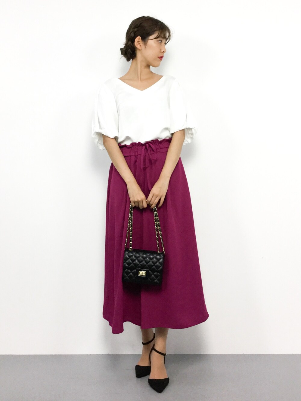さつまいもが大好きな人のコーデ◎ こっくりとした色味が素敵なピンクのスカーチョは、 深みのあるカラーなのでオトナ女子にもオススメです♪