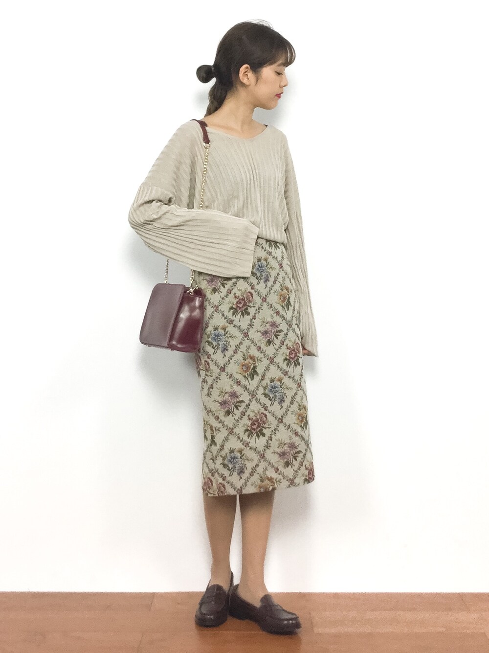 yuki(ZOZOTOWN)のニット/セーター「テロンとした落ち感のある素材◆オーバーサイズフレアスリーブVネックドロップショルダーリブ長袖ニットトップス」を使ったコーディネート