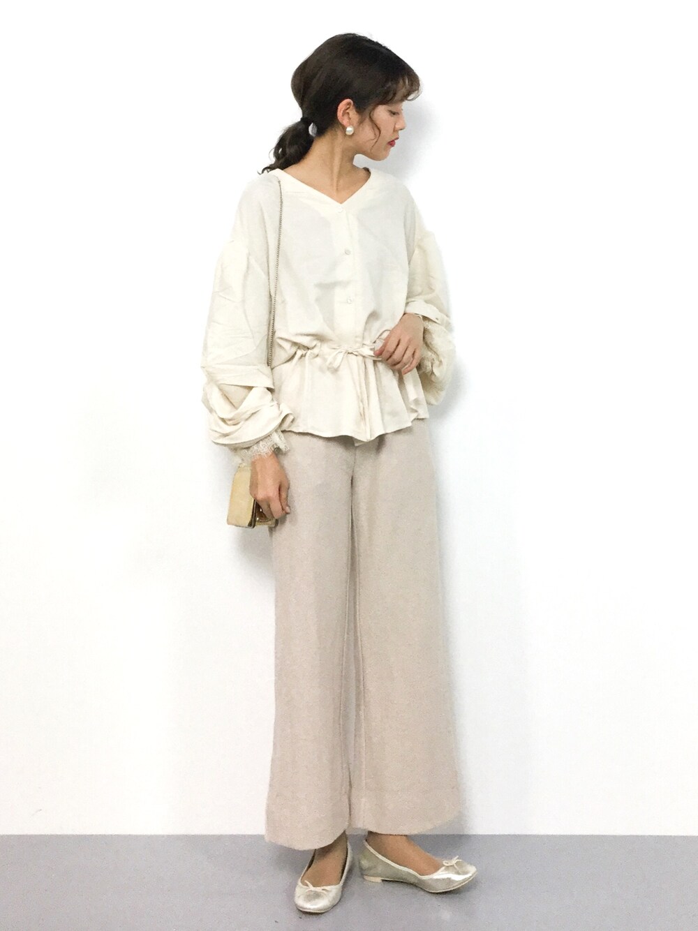 ワントーンコーデ◎ ブラウスは柔らかい素材で、袖のボリューム感がすごく可愛いです。