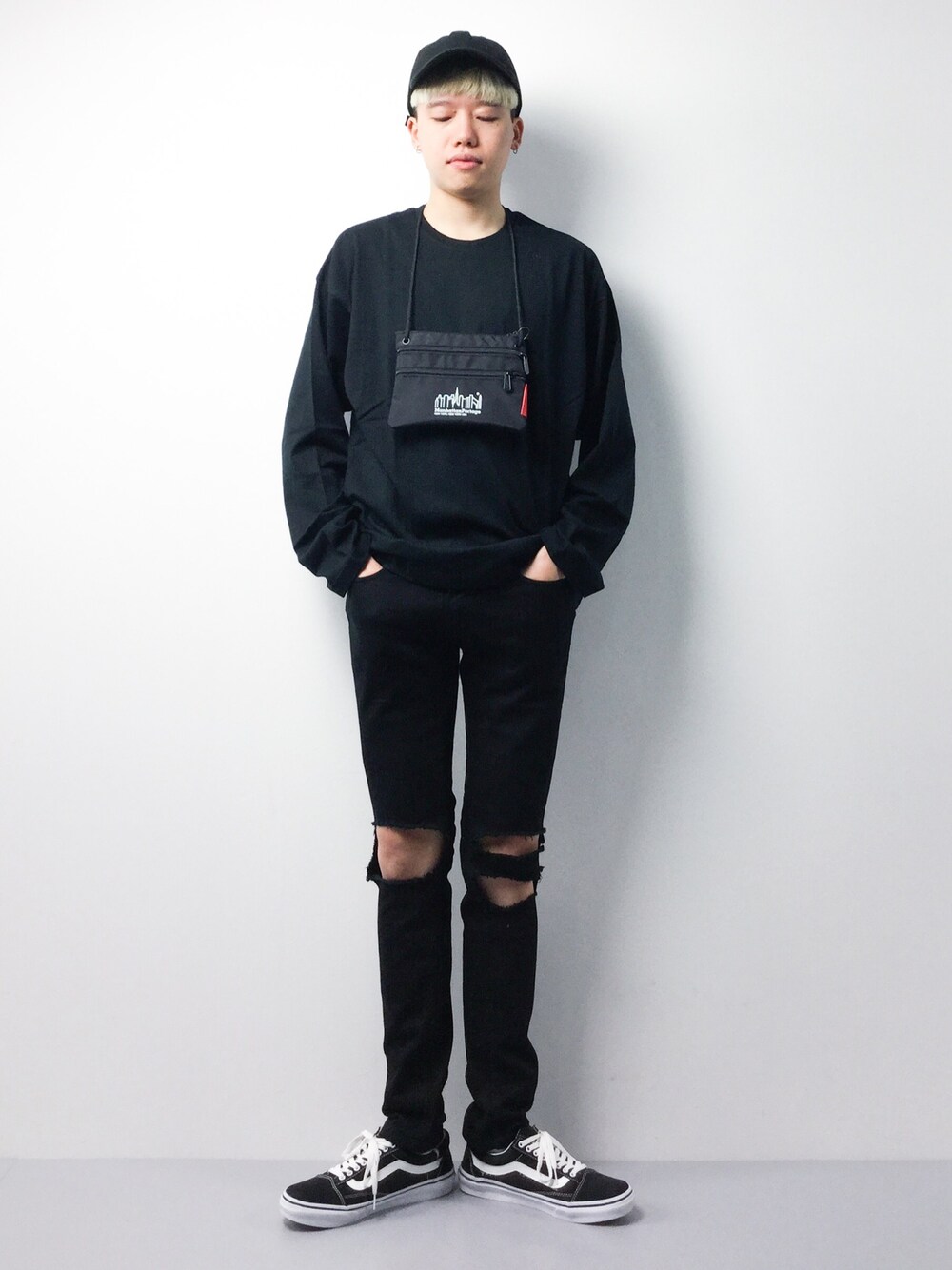 オールブラックでまとめた、ストリートコーディネートです。 トップスが、ドロップシルエットのルーズなアイテムなので、 パンツは細身のものを選び、Yラインになるよう意識しました。 またサコッシュを取り入れ、トレンドに敏感な風合いをプラスしています。 ▼staff spec 身長:178cm、体重:55kg 頭周り:57cm 肩幅:40cm、胸囲:80cm、胴囲:82cm ウエスト:80cm、ヒップ:85cm、股下:88.5cm、もも周り:46cm 靴:26.5cm、足長:25.5cm、足囲:23cm、足幅:10cm、甲周り:25cm