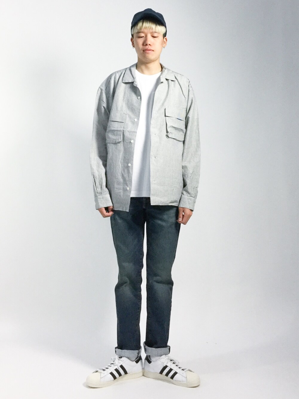流行のシルエットを取り入れた、ストリートコーディネートです。 トップスに、今最もホットなオーバーサイズのシャツを使い、 少し抜き襟気味に着て、VETEMENTSのシルエットを意識しました。 色は無難にネイビー×ホワイトで合わせて、シルエットが際立つようにしました。 ▼staff spec 身長:178cm、体重:55kg 頭周り:57cm 肩幅:40cm、胸囲:80cm、胴囲:82cm ウエスト:80cm、ヒップ:85cm、股下:88.5cm、もも周り:46cm 靴:26.5cm、足長:25.5cm、足囲:23cm、足幅:10cm、甲周り:25cm