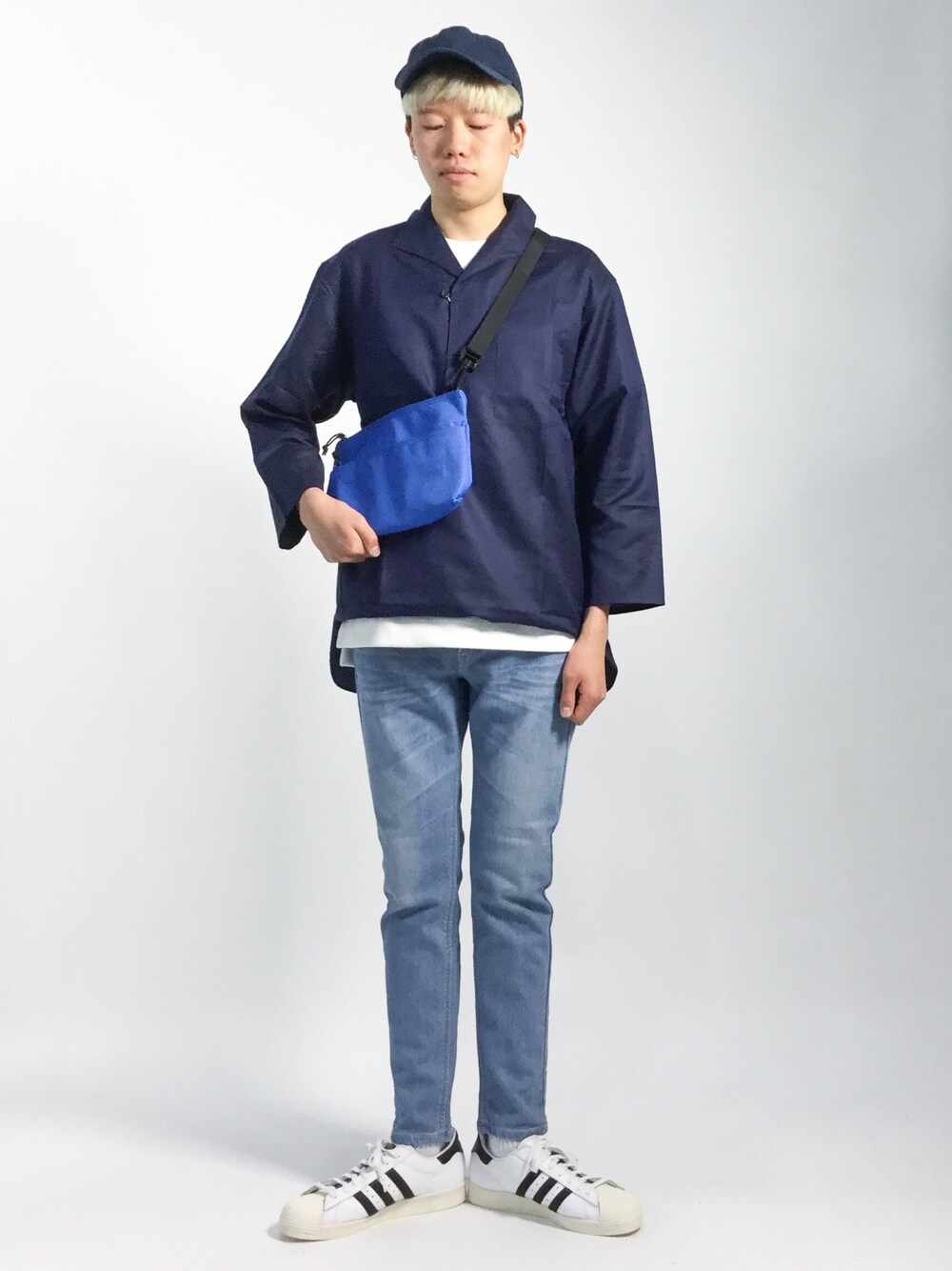 青系に、無難に白を合わせた、ストリートコーディネートです。 トップスの胸元がざっくりと空いているので、 白Tでカバーすると共に、丈の長いものを着て、レイヤードスタイルに仕上げました。 またワンポイントで流行のサコッシュを持ち、ハッキリとした色を加えて、 コーディネートに締まりをもたらしました。 ▼staff spec 身長:178cm、体重:55kg 頭周り:57cm 肩幅:40cm、胸囲:80cm、胴囲:82cm ウエスト:80cm、ヒップ:85cm、股下:88.5cm、もも周り:46cm 靴:26.5cm、足長:25.5cm、足囲:23cm、足幅:10cm、甲周り:25cm
