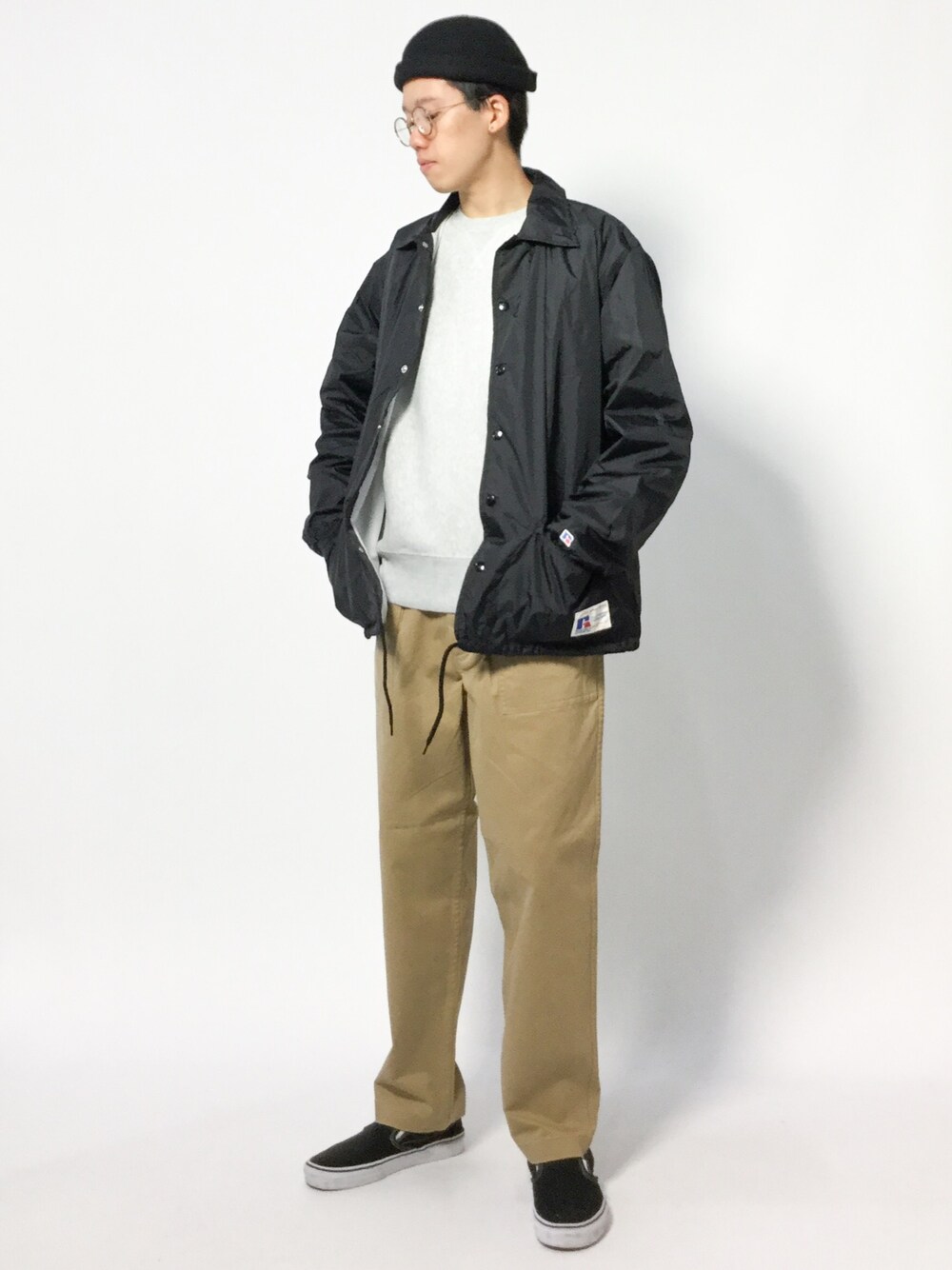 パンツのベージュをベースに、モノトーンでまとめた、ストリートコーディネートです。 ▼staff spec 身長:178cm、体重:55kg 頭周り:57cm 肩幅:40cm、胸囲:80cm、胴囲:82cm ウエスト:80cm、ヒップ:85cm、股下:88.5cm、もも周り:46cm 靴:26.5cm、足長:25.5cm、足囲:23cm、足幅:10cm、甲周り:25cm