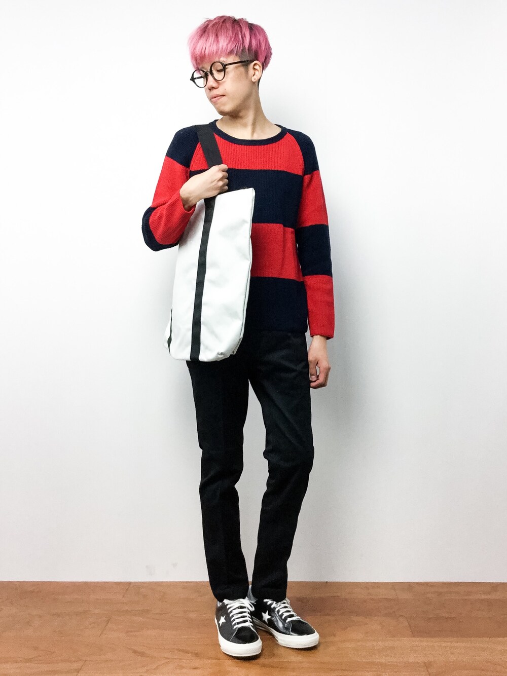全体的に黒でまとめたコーディネートです。そのため、トップスの赤がキレイに映えます。 ▼staff spec 身長:176cm、体重:58kg 頭周り:57cm 肩幅:40cm、胸囲:80cm、胴囲:82cmウエスト:80cm、ヒップ:85cm、股下:91cm、もも周り:46cm 靴:26.5cm、足長:25.5cm、足囲:23cm、足幅:10cm、甲周り:25cm