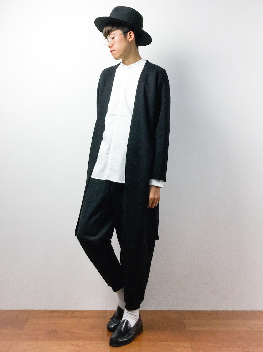 全体的にモノトーンで統一した、モード系カジュアルコーディネートです。 ▼staff spec 身長:176cm、体重:58kg 頭周り:57cm 肩幅:40cm、胸囲:80cm、胴囲:82cm ウエスト:80cm、ヒップ:85cm、股下:91cm、もも周り:46cm 靴:26.5cm、足長:25.5cm、足囲:23cm、足幅:10cm、甲周り:25cm