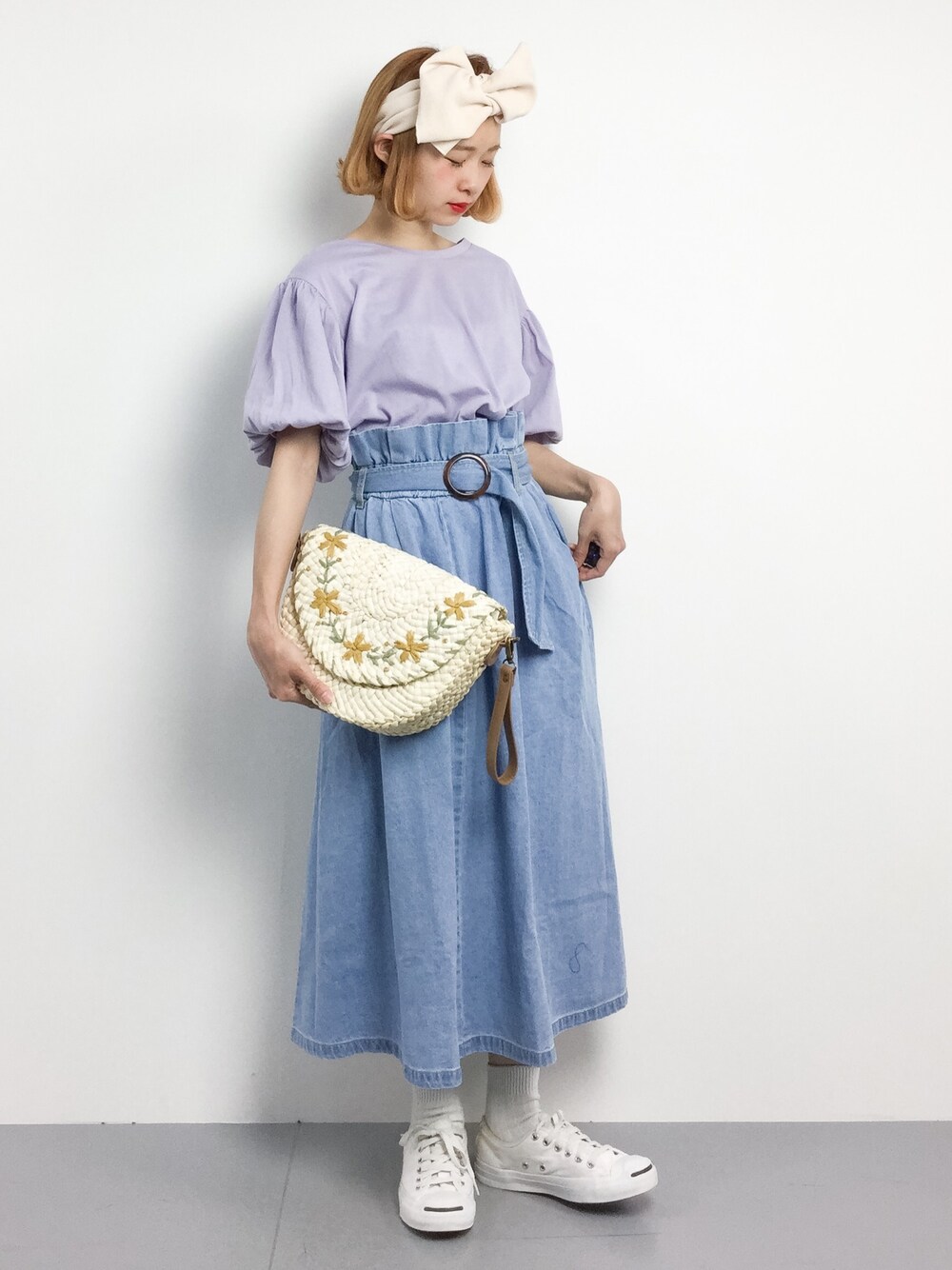 着用コーデ:14件チョコビ(ZOZOTOWN)のデニムスカート「ラウンドバックルベルト付きフレアデニムスカート」を使ったコーディネート