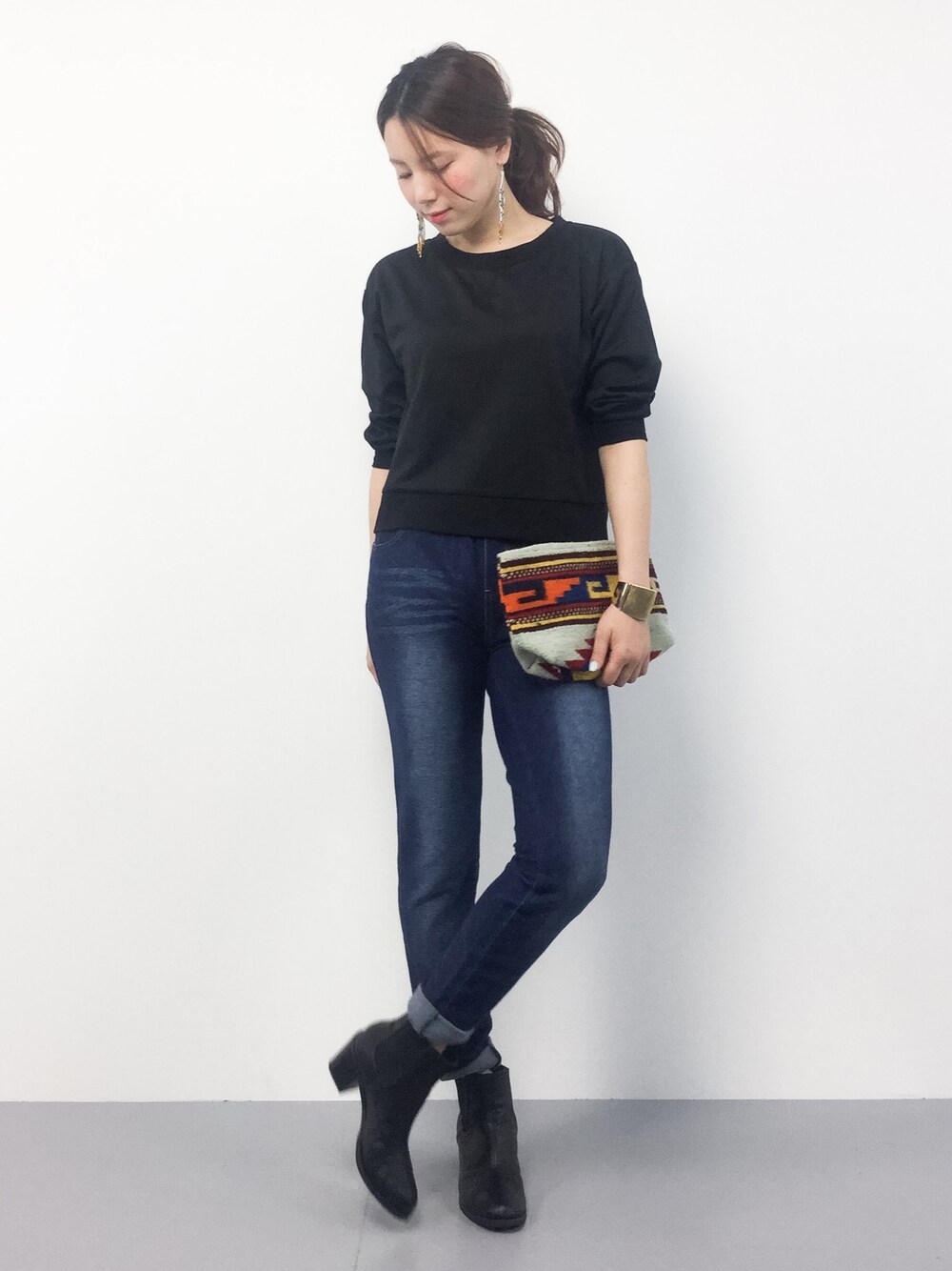 カジュアルなアイテムをブラックを多めにしてかっこよく仕上げたコーデです。 このパンツは見た目はパキッとしたスキニーに見えますが、実際はとてもストレッチが効いていて、穿き心地抜群です♪ スウェットはボリュームが強くハリ感もあるので1枚で見栄えが良く、ラフすぎないところが 良いポイントでした。
