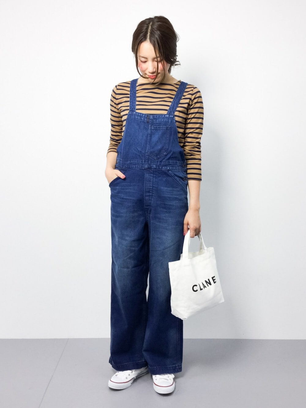 ボーダー×オーバーオール★ スニーカーとカジュアルトートを合わせてラフなスタイルに♩ 秋のお出かけにオススメです!