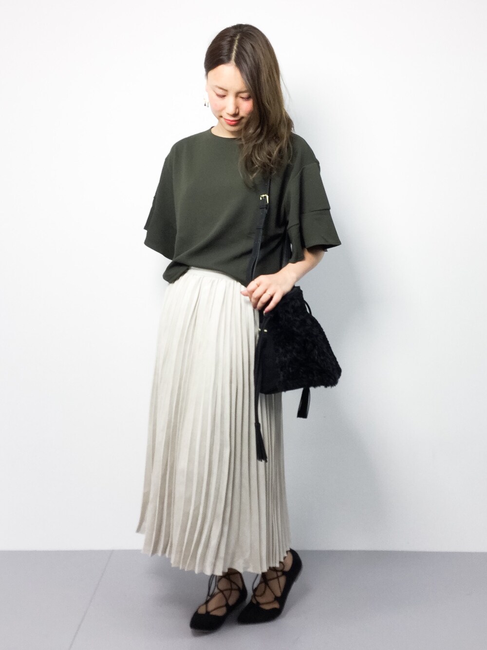 フレアスリーブのブラウスにプリーツスカートをあわせた女の子コーデ♩ このブラウス、とても伸縮性があるので着やすかったです★ スカートはスウェード調になっています!