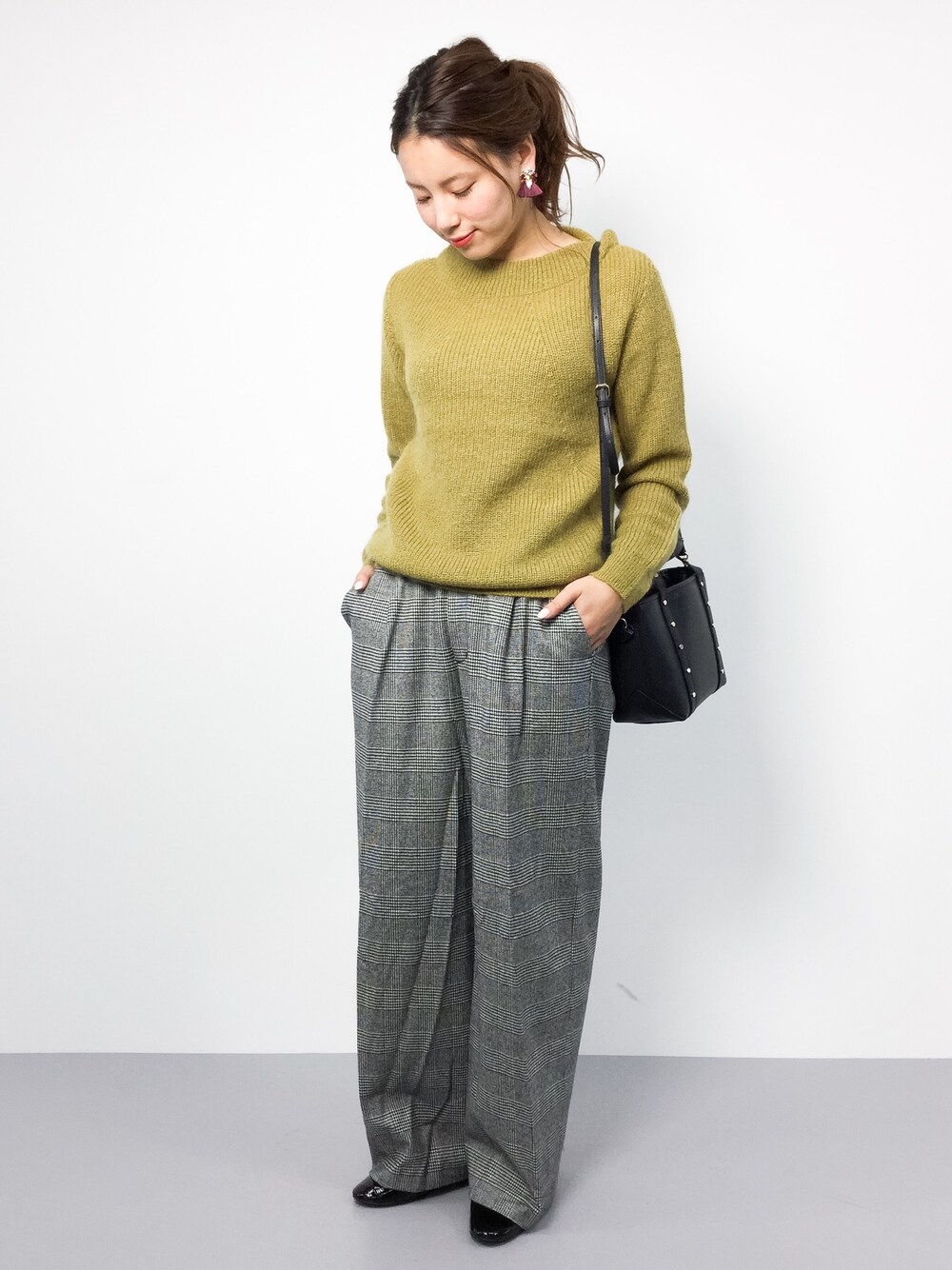 優しいカラーのハイネックニット☆ 柔らかくて暖かい、シンプルなニットにワイドパンツを合わせました♪ 秋のお出かけにオススメ◎