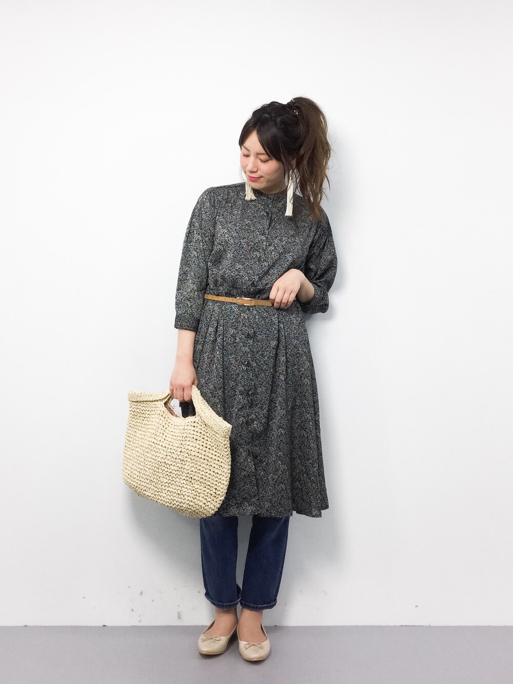 花柄のロングワンピース♪ 前のボタンが全開できるのでガウンとしても使えるアイテム☆ ノーカラーなのでスッキリしています◎ デニムと相性がいいのでレイヤードで着用しました!