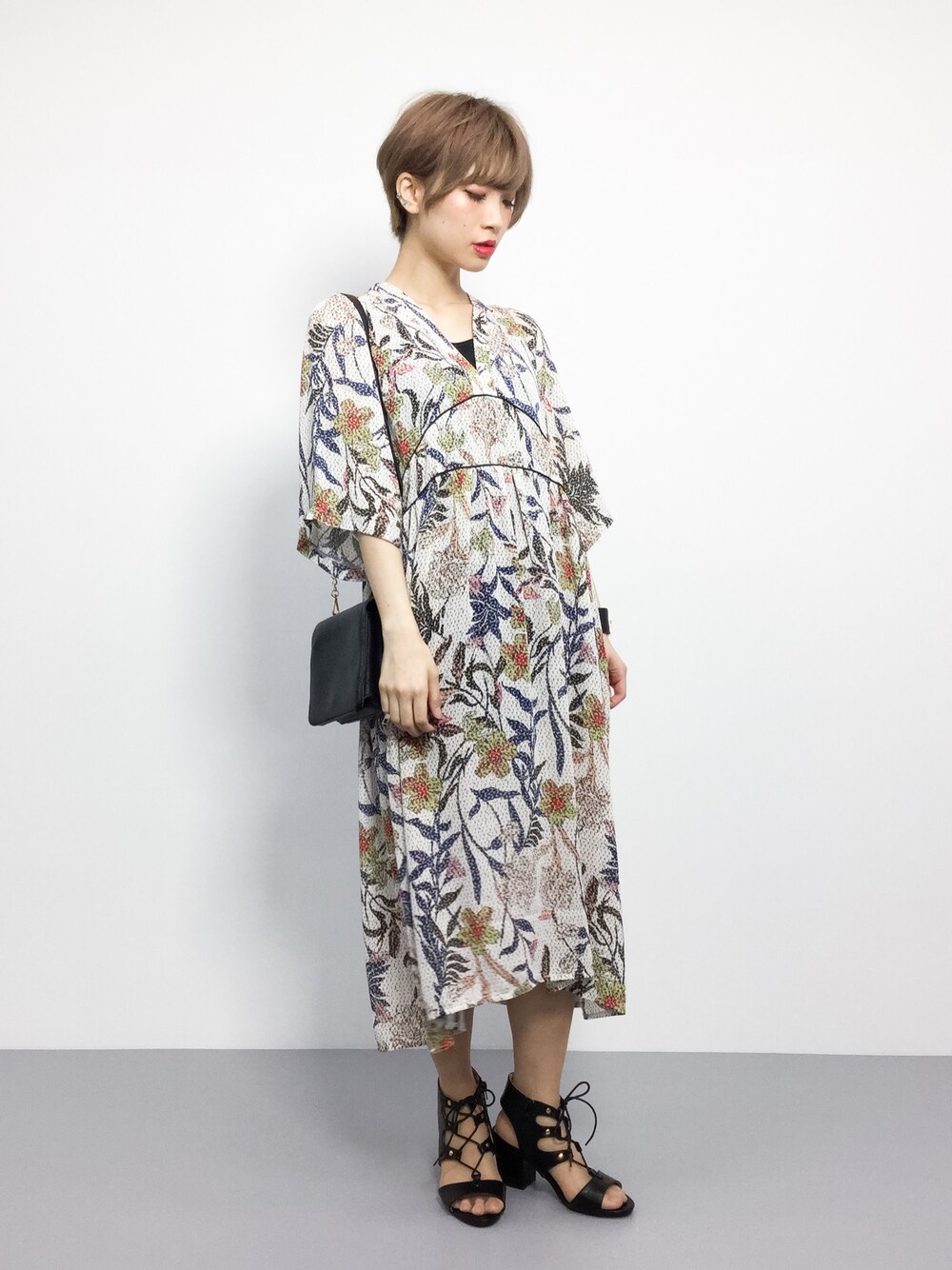 ゆったり柄ワンピのらくちんコーデ○ 小物を黒でまとめて引き締めました!