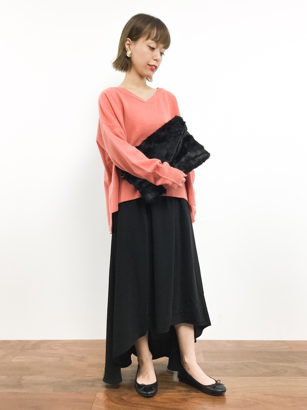 オトナ女子コーデ☺︎ 全体をブラックでまとめて、ピンクのカシミヤニットをポイントにしました☺︎