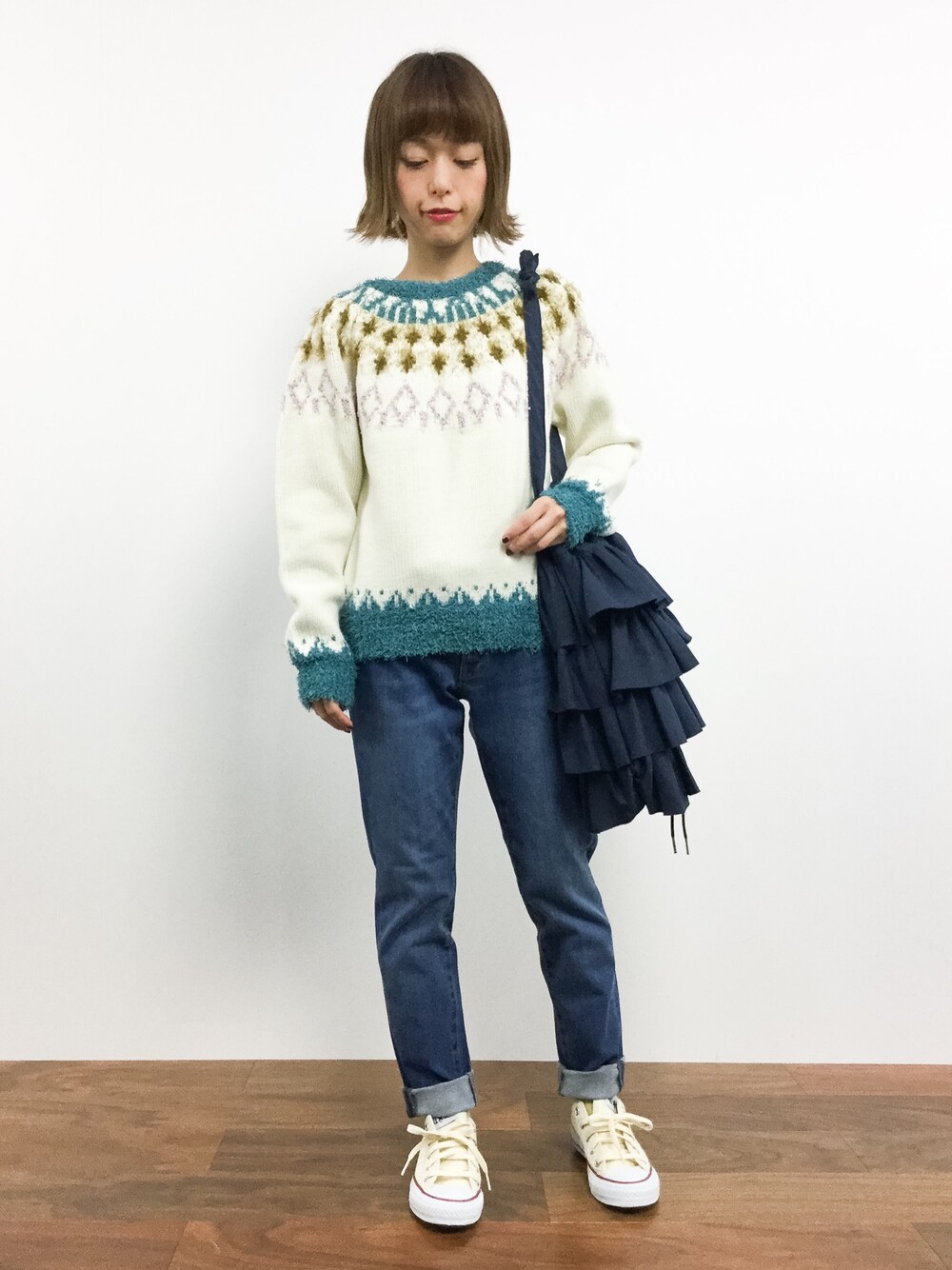 カジュアルコーデ☺︎ ノルディック柄のニットを主役にデニムと合わせてカジュアルにしました☺︎