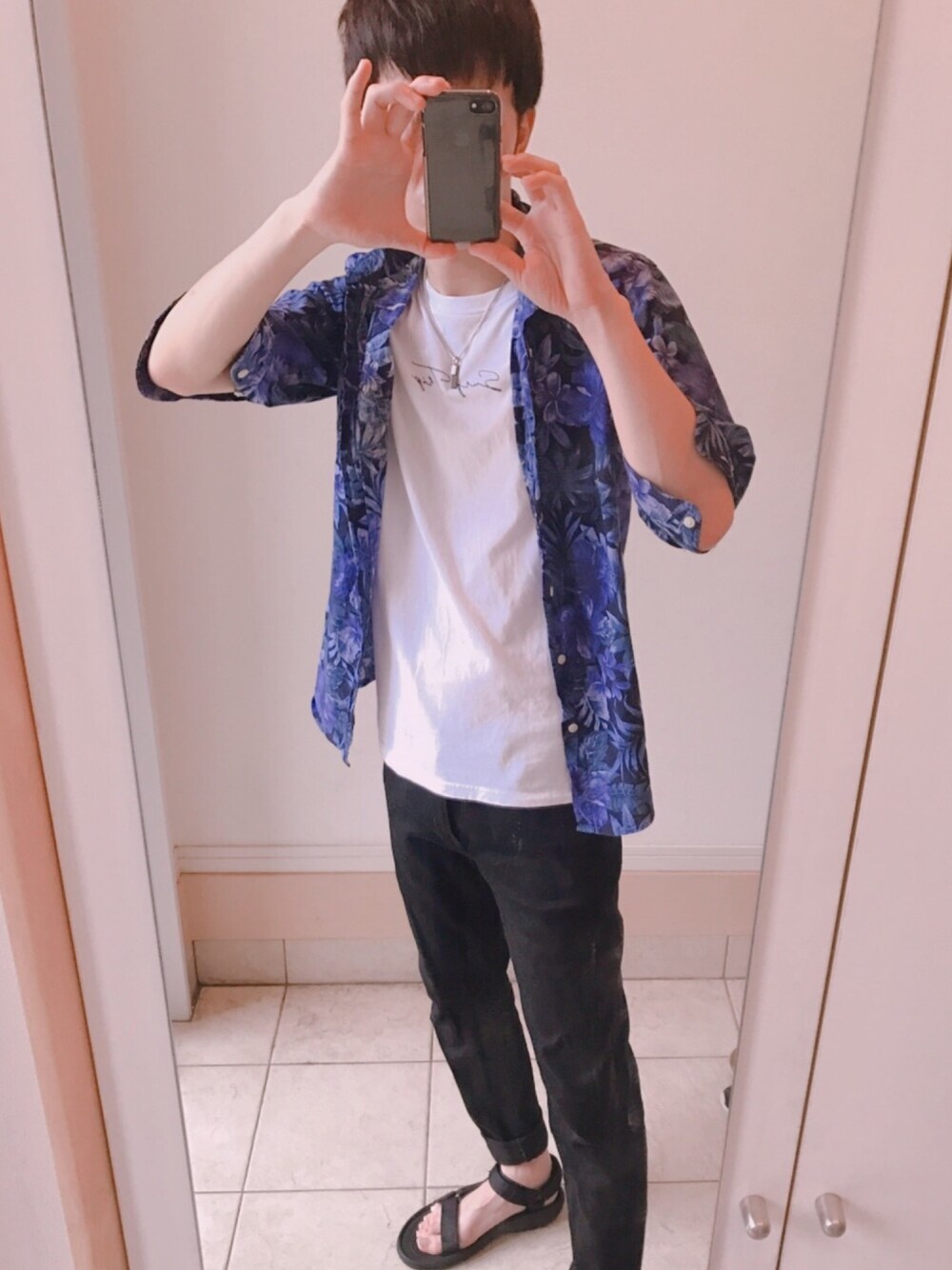 【大人のプチプラコーデ④】 ご覧頂きありがとうございます。 夏に向けて柄シャツコーデをしてみました!個人的にブルーは好きな色です。 いつも、モノトーンコーデが多いけど、色物を色一つ入れるだけで、雰囲気変わっていいですよね😎🎵 【サイズ】 シャツ M Tシャツ L パンツ 30