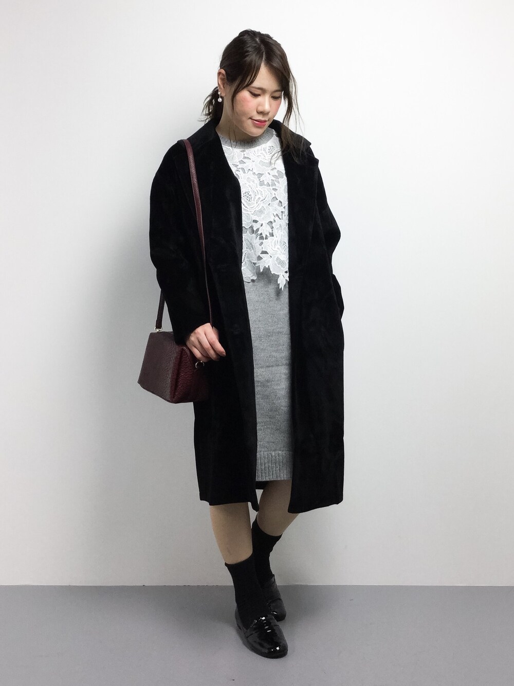 ワンピース×チェスターコートで大人カジュアル◎ レースワンピースなので、フェミニンな印象です♪