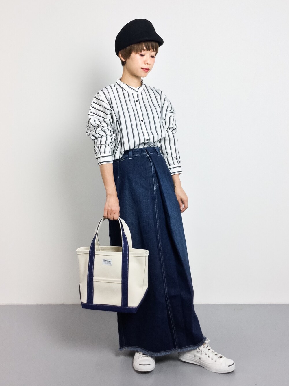 大人カジュアル ノーカラーシャツにデニムスカートを合わせました